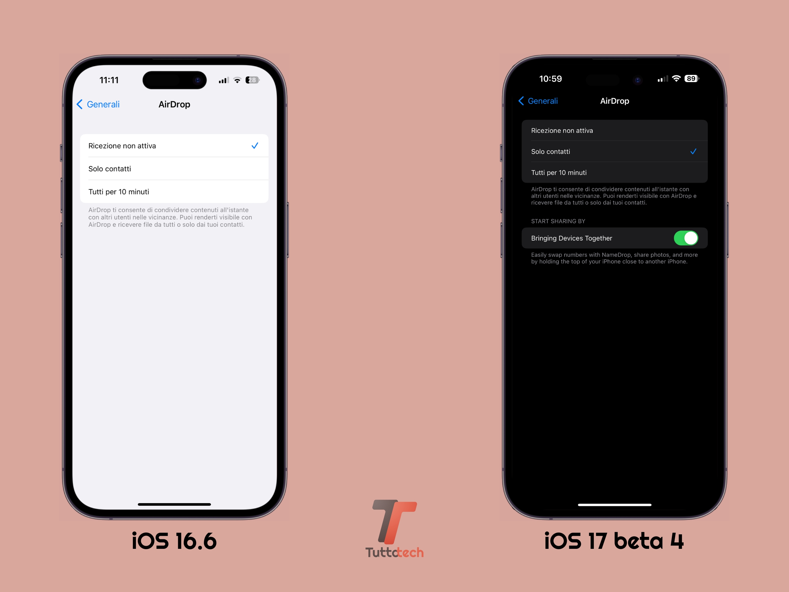 Con la beta 4 di iOS 17, Apple ha aggiunto un nuovo toggle al percorso “Impostazioni > Generali > AirDrop” che consente agli utenti di disabilitare la possibilità di avviare trasferimenti tramite AirDrop avvicinando due dispositivi. Come potete apprezzare dalla seguente immagine, il toggle non è presente sulla più recente versione stabile del sistema operativo (e non era presente nemmeno nelle precedenti beta di iOS 17).