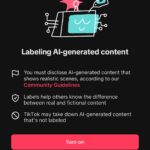 Attivando il sopracitato interruttore è apparso un nuovo pop-up che ricorda gli utenti che dovranno etichettare adeguatamente i loro contenuti realizzati dall’intelligenza artificiale che mostrano “scene realistiche”, altrimenti TikTok potrebbe rimuoverli.
