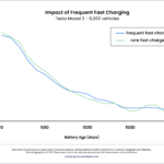 Lo studio ha coinvolto, fra le altre (oltre 12.500 auto complessivamente), circa 6.300 Tesla Model 3 e 4.400 Tesla Model Y, auto che sono state confrontate in questo modo: da una parte ci sono quelle che sono state ricaricare per almeno il 90% delle volte con la ricarica rapida, viceversa, dall’altra quelle che vengono ricaricate nella maggior parte dei casi con sistemi di ricarica lenta. I risultati che ne derivano mostrano differenze praticamente irrisorie che si evincono dai grafici che seguono: il numero di giorni d’utilizzo sull’asse delle ascisse e la percentuali dell’autonomia residua rispetto all’originale visualizzate sul cruscotto sull’asse delle ordinate.
