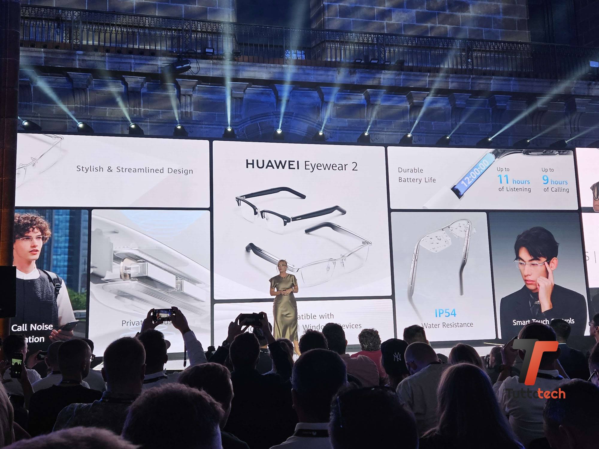 Da segnalare anche i nuovi occhiali smart Huawei Eyewear 2, che permettono ad esempio di effettuare chiamate, con riduzione del rumore inclusa, e integrano dei comandi smart touch per controllare i dispositivi collegati. Sono certificati IP54 per la resistenza a schizzi d’acqua e polvere, e montano una batteria che garantisce fino a 11 ore di ascolto e fino a 9 ore di chiamate.