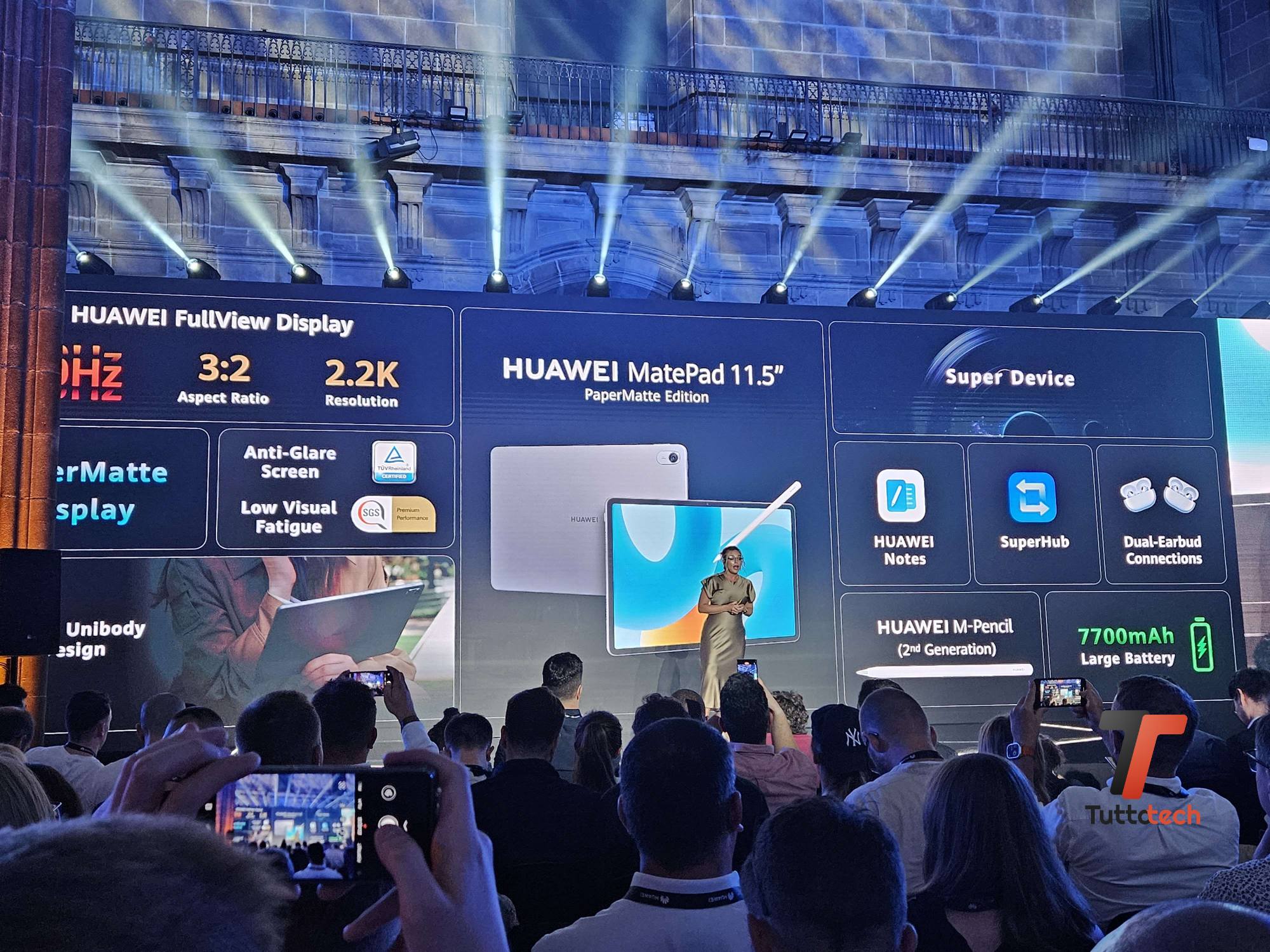 Per quanto riguarda invece il nuovo tablet Huawei MatePad 11.5 PaperMatte Edition, si tratta di un dispositivo dotato di uno schermo da 11,5″, per l’appunto, in formato 3:2 e con risoluzione 2,2K con tecnologie per ridurre bagliori e affaticamento degli occhi. Arriva con la Huawei M-Pencil di seconda generazione e, come intuibile dal nome, rispetto alla versione standard, vanta un particolare rivestimento del display che dovrebbe garantire all’utente una sensazione simile a quella della carta. La batteria è da 7.700 mAh. Anche in questo caso, il produttore non ha comunicato altre informazioni, ma vi aggiorneremo non appena ne sapremo di più.