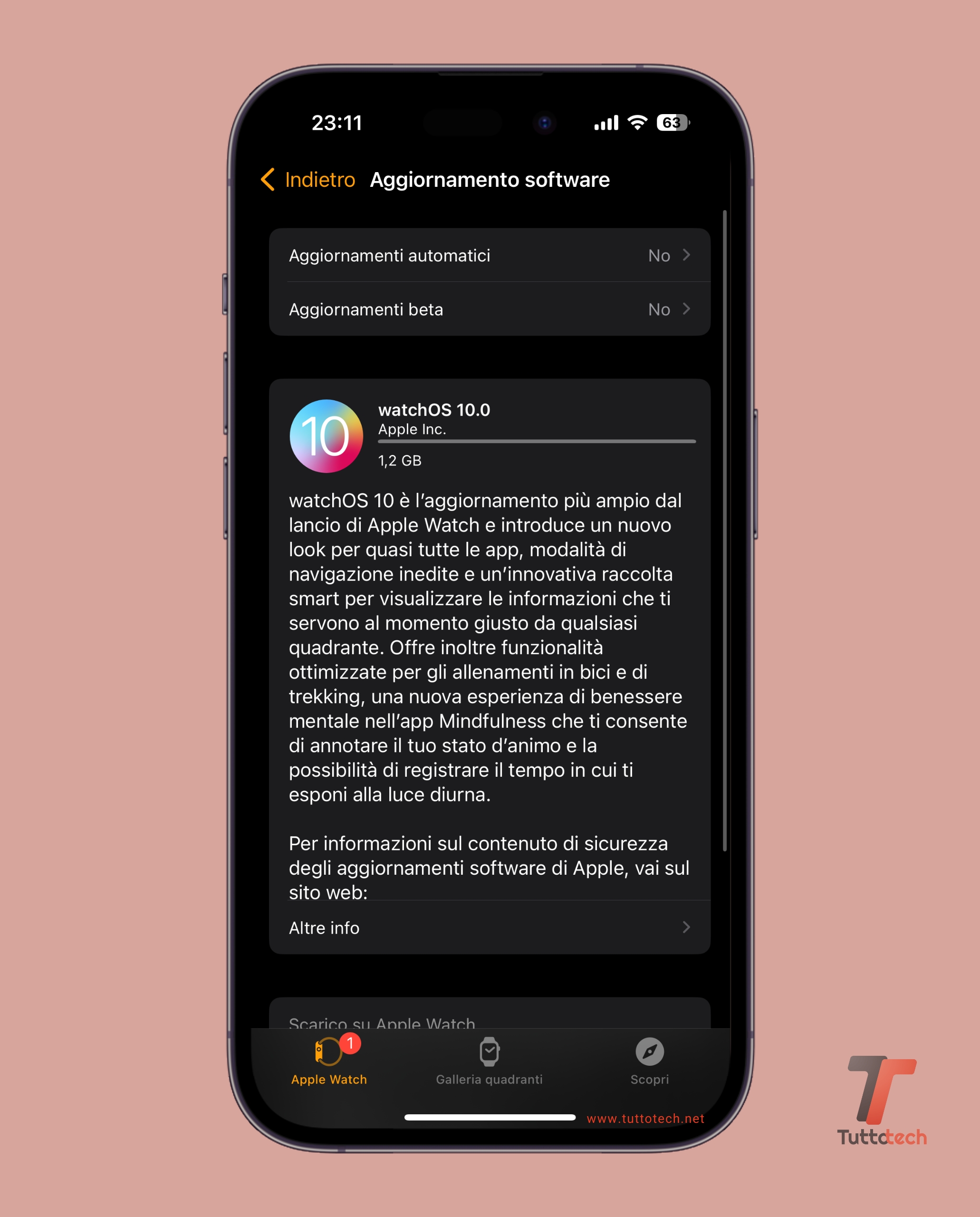 - Per aggiornare Apple Watch è sufficiente aprire l’app Watch presente sul proprio iPhone e seguire il percorso “Generali > Aggiornamento software” e selezionare “Scarica e installa” quando verrà rilevata la presenza del nuovo aggiornamento; per procedere, iPhone e Apple Watch dovranno rimanere nel raggio di portata della connessione, mentre lo smartwatch dovrà avere almeno il 50% di carica ed essere mantenuto in carica. Per potere installare watchOS 10, l’app Watch richiede che sull’iPhone associato sia stato effettuato l’aggiornamento ad iOS 17.