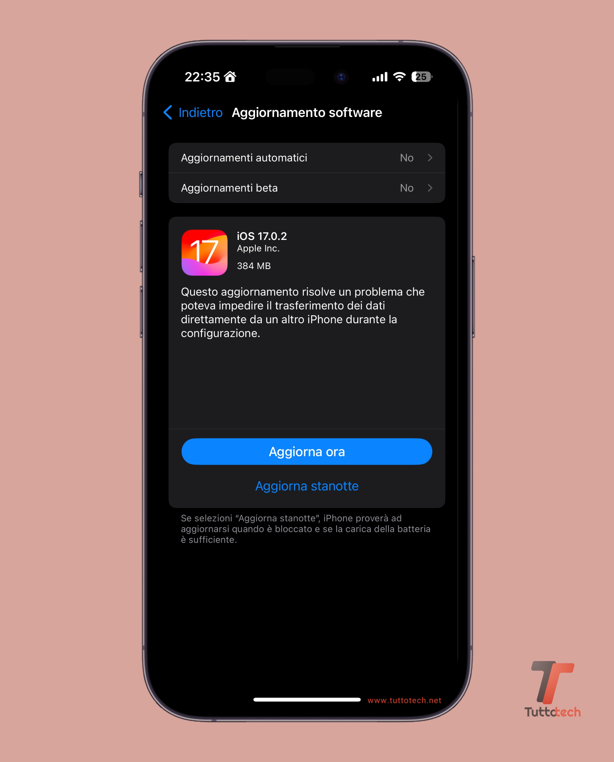 Dopo averlo rilasciato inizialmente per i soli iPhone 15, Apple ha esteso l’aggiornamento a iOS 17.0.2 e iPadOS 17.0.2 su tutti gli iPhone e iPad compatibili. Come viene specificato nel changelog, l’aggiornamento risolve un problema legato al trasferimento dei dati da un altro iPhone (o da un altro iPad, nel caso di iPadOS) durante la fase di configurazione.