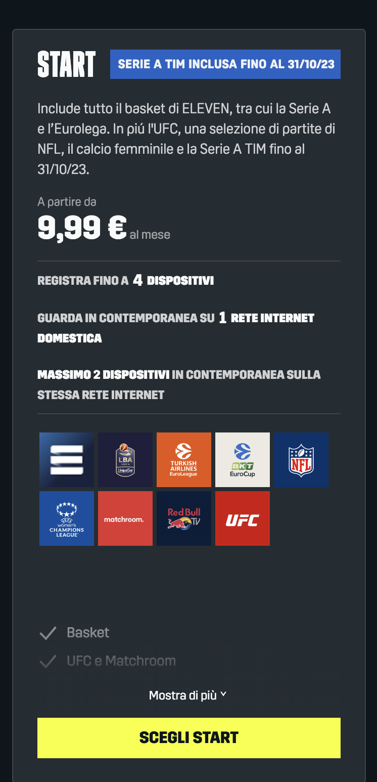 I più attenti tra di voi ricorderanno probabilmente che DAZN aveva creato il piano Start la scorsa estate, a seguito dell’uscita di ELEVEN Sports dal mercato italiano e della sua acquisizione ad opera dello stesso Gruppo DAZN: grazie a questo nuovo piano, DAZN aveva di fatto assorbito la clientela che era solita guardare le partite di basket italiano ed europeo su ELEVEN Sports. Essendo questo il target dell’offerta, DAZN Start è il piano meno costoso della piattaforma, ma non include il calcio.
