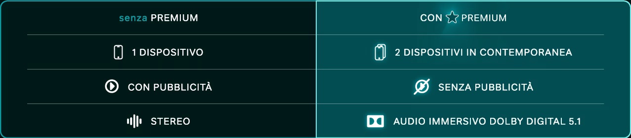 La funzionalità Premium che, costo di 5 euro al mese per i nuovi abbonati (è invece inclusa gratuitamente per i vecchi abbonati finché non disdicono i loro pass), aggiunge sostanzialmente tre funzionalità all’abbonamento base: la visione contemporanea su due dispositivi (applicabile a tutti i Pass), la possibilità di guardare i contenuti on demand senza pubblicità (che sarà ovviamente presente per tutti, invece, sui canali in diretta di Sky) e l’audio immersivo (con tecnologia Dolby Digital 5.1).