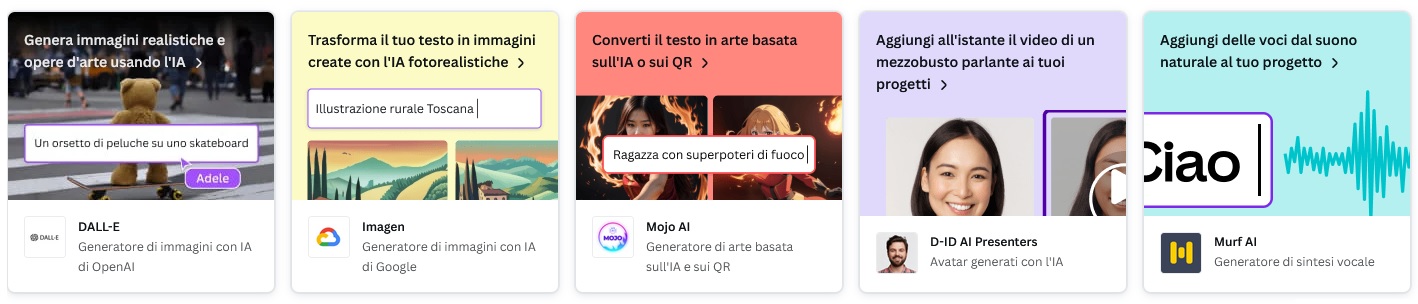 Oltre agli strumenti magici, Canva consente di accedere a moltissime app di terze parti basate sull’intelligenza artificiali: tra queste vi sono i generatori d’immagini DALL-E (di Open AI), Imagen (di Google) e Mojo AI, il generatore di avatar D-ID AI Presenters (genera un mezzobusto parlante da aggiungere a un video) e Murf AI (un generatore di sintesi vocale che consente di aggiungere voci “naturali” al progetto).