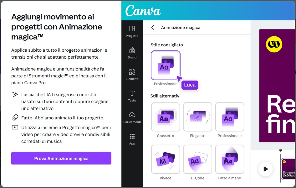 - Animazione magica: questo strumento si preoccupa di aggiungere a un progetto le animazioni/transizioni giuste nel posto giusto (in generale consiglia all’utente quale sia lo stile di animazioni più adatto per lo specifico progetto).