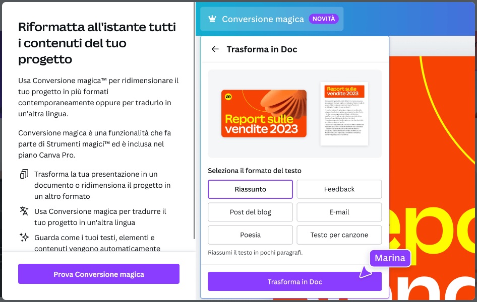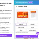 - Conversione magica: consente di ridimensionare un progetto in più formati diversi (ad esempio trasforma un’immagine in un documento); consente inoltre di tradurre un progetto in un’altra lingua.