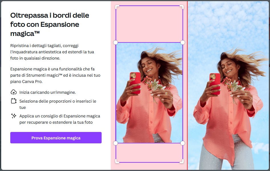 - Espansione magica: si tratta di uno degli strumenti più “in voga” del momento (soprattutto grazie a Photoshop), ovvero quello che permette di estendere un’immagine in qualsiasi direzione, partendo da una foto; lo strumento permette di scegliere tra un set di proporzioni specifiche ma offre anche comode maniglie da spostare per allargare l’immagine a proprio piacimento; c’è anche un comando che permette di far fare automaticamente allo strumento.