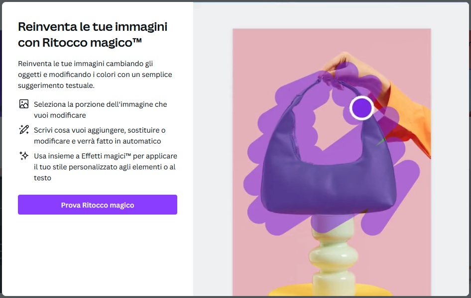 - Ritocco magico: consente di ritoccare un’immagine in toto o in un suo particolare; basterà evidenziare la parte che si vuole andare a modificare, descrivere la modifica che si ha in mente e aspettare che l’intelligenza artificiale faccia il resto.