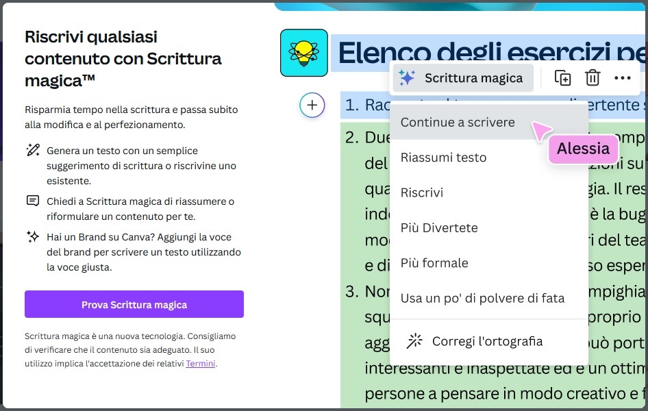 Il primo strumento magico di Canva è la Scrittura magica, uno strumento che consente di generare un testo partendo da un suggerimento di scrittura o riscrivendo un testo già esistente. Lo strumento si occuperà di riassumere o riformulare il testo.