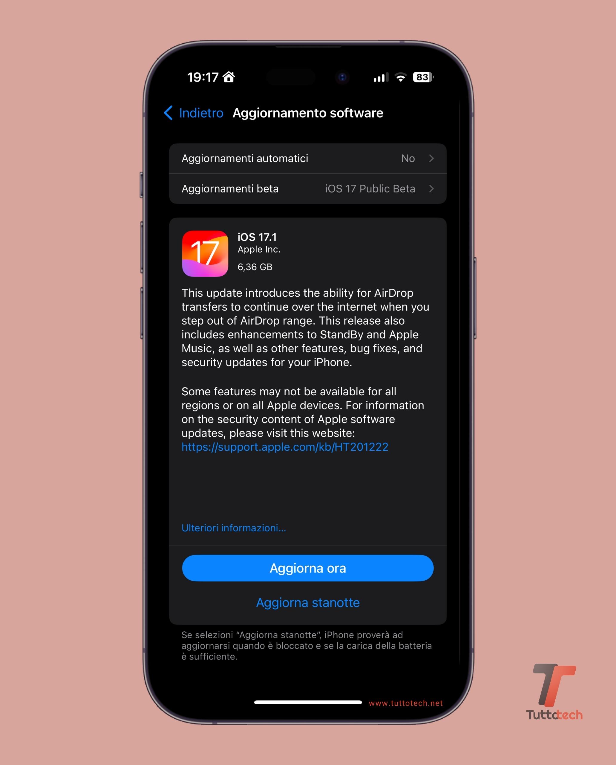 Nello specifico di iOS 17.1, la build che porta con sé la Release Candidate ha un peso di 6,36 GB su iPhone 14 Pro (provenendo da iOS 17.0.3). Nel caso in cui sviluppatori o beta tester pubblici non riscontrassero bug o malfunzionamenti, questa stessa build sarà poi distribuita, la prossima settimana, via OTA su tutti i dispositivi supportati.