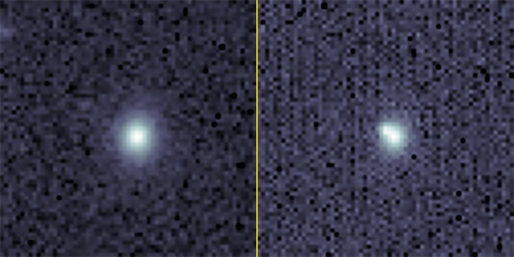 Un prima-dopo: la regione in alto a sinistra del corpo celeste dell’immagine di destra è deforme, a testimonianza dell’esplosione della stella.