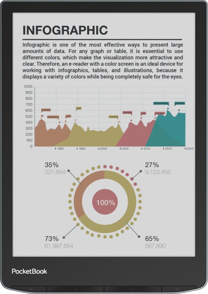La più grande novità di PocketBook InkPad Color 3 è rappresentata dallo schermo, un pannello E Ink Kaleido 3 che va a sostituire il Kaleido Plus del modello precedente. La risoluzione raggiunge i 1404 x 1872 pixel in scala di grigi, con una risoluzione di 300 ppi, e di 702 x 926 pixel a colori, con una densità pari a 150 ppi, il doppio rispetto a InkPad Color 2.