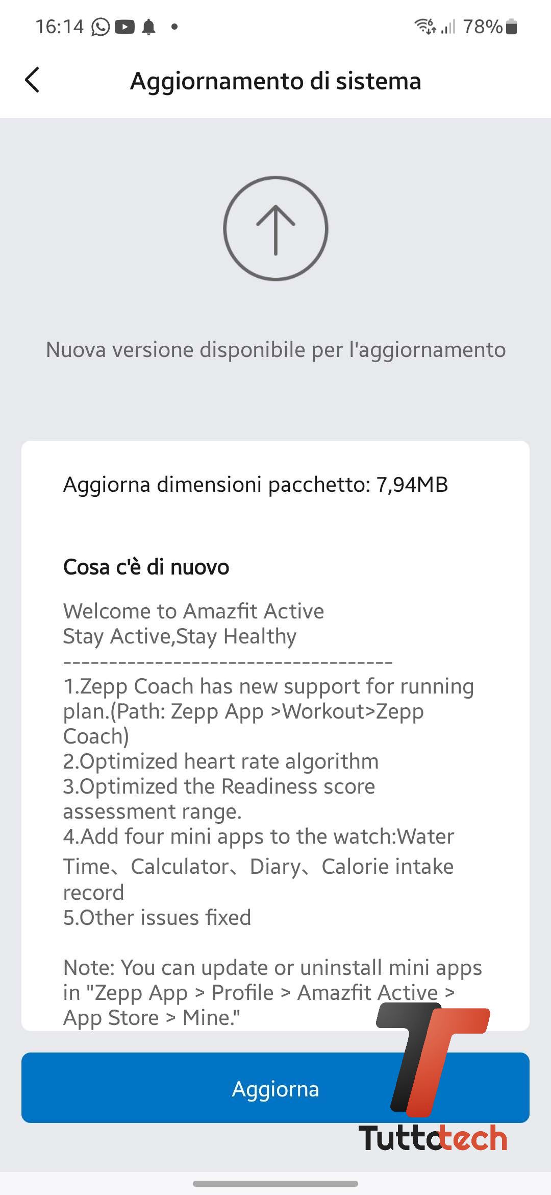 Si aggiorna anche Active, l’ultimo arrivato nella serie di orologi di Amazfit, con un update da 7,94 MB che aggiunge il supporto dei piani di allenamento per la corsa di Zepp Coach, quattro mini app (gli avvisi per idratarsi, una calcolatrice, un diario e un registratore delle calorie ingerite), e, oltre ad alcune correzioni non meglio specificate, l’ottimizzazione degli algoritmi relativi alla funzione Readiness (prontezza fisica e mentale) e al monitoraggio della frequenza cardiaca.