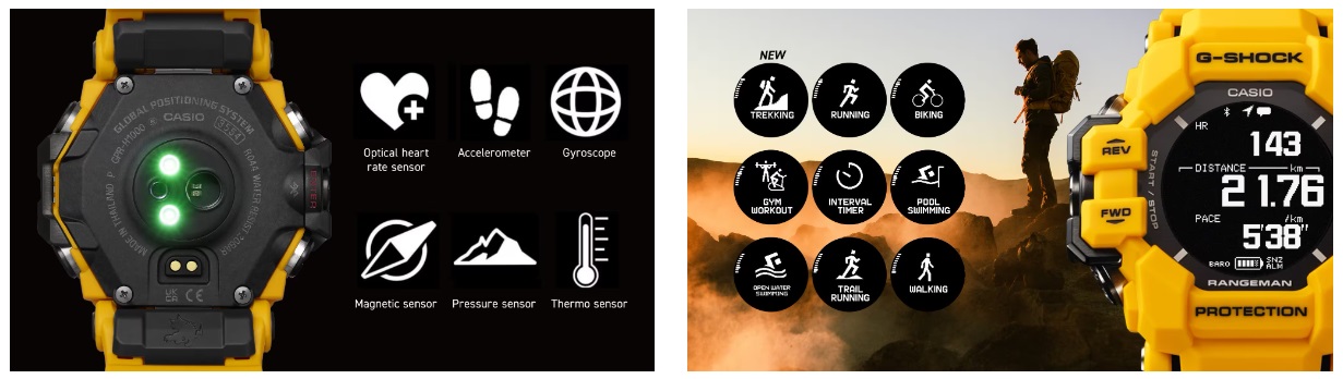Il nuovo Casio GPR-H1000 è dotato di sensore magnetico per la bussola, sensore per l’altitudine/pressione barometrica e sensore di temperatura, inoltre è dotato di un sensore ottico per la frequenza cardiaca, un accelerometro per monitorare l’attività come il numero di passi effettuati e un giroscopio per una calibrazione precisa della bussola, in più è inclusa la funzionalità GPS per ottenere dati sulla posizione.