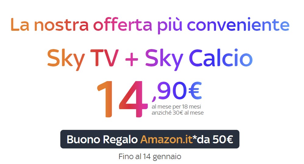 Offerta Sky solo fino al 14 Gennaio. C’è un’ottima offerta pensata per garantire l’accesso a molti contenuti del catalogo Sky. In particolare, si tratta di un’offerta combinata Sky TV + Sky Calcio, disponibile al costo di 14,90 euro al mese, con un buono regalo Amazon da 50 euro.