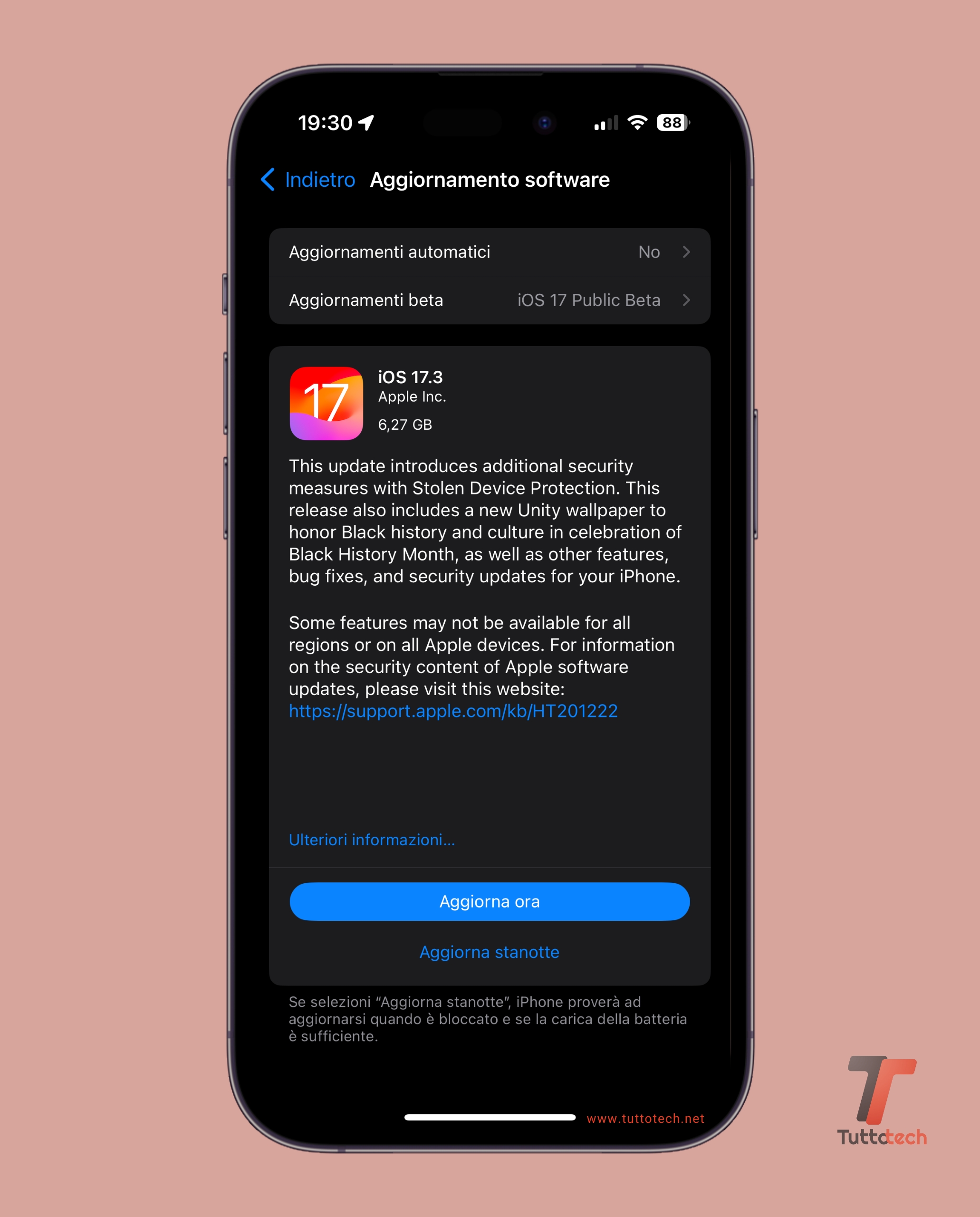 Nello specifico di iOS 17.3, la build che porta con sé la Release Candidate ha un peso di 6,27 GB su iPhone 14 Pro (provenendo da iOS 17.2.1). Nel caso in cui sviluppatori o beta tester pubblici non riscontrassero bug o malfunzionamenti, questa stessa build sarà poi distribuita, la prossima settimana, via OTA su tutti i dispositivi supportati.