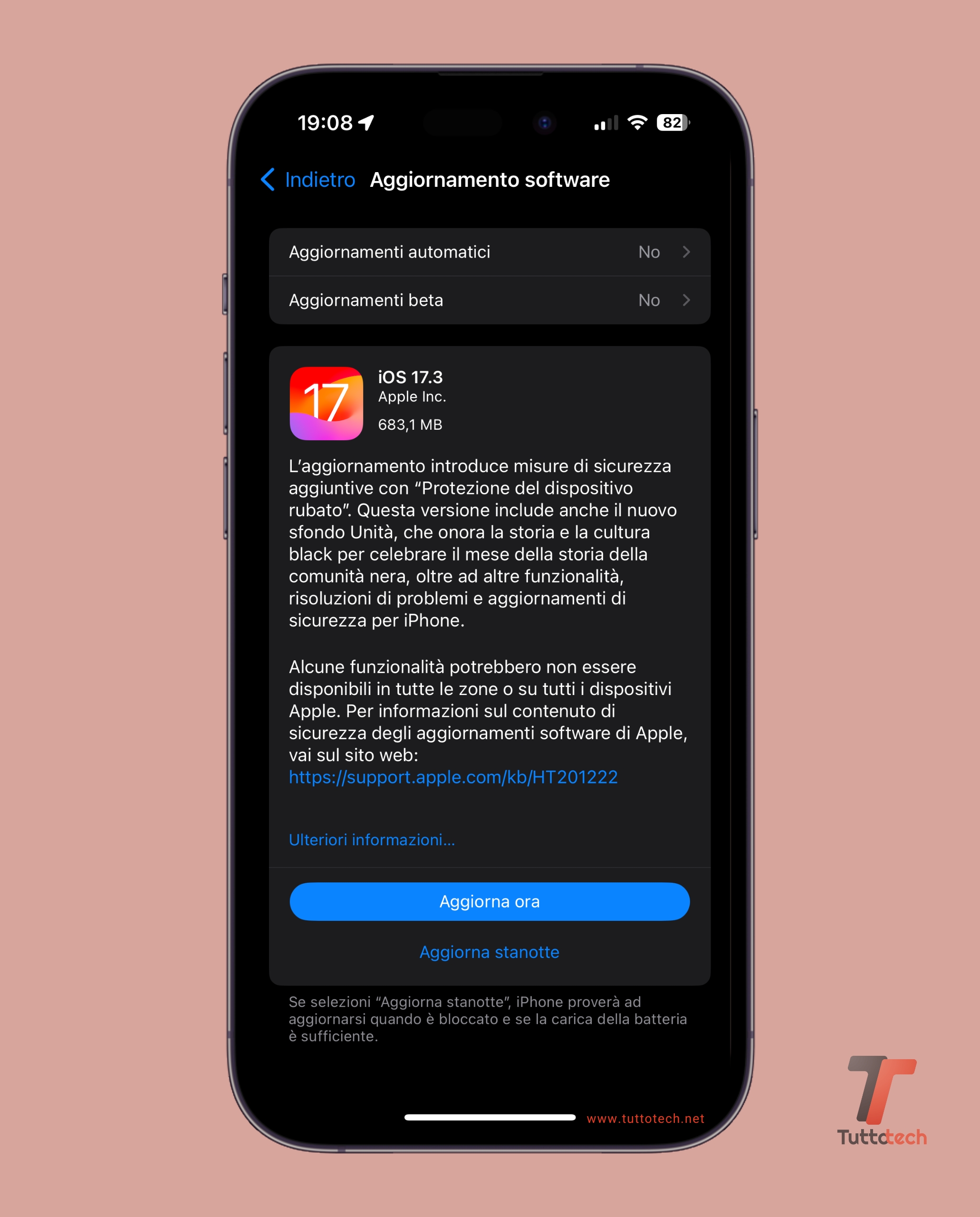 - Per aggiornare gli iPhone (da iPhone Xs/Xr in poi) è sufficiente seguire il percorso “Impostazioni > Generali > Aggiornamento Software”, attendere che venga rilevato l’aggiornamento ed effettuare un tap su “Aggiorna ora“. È necessario che l’iPhone abbia carica residua sufficiente (almeno il 20%) o che sia collegato al caricabatterie. La stessa procedura vale per iPadOS 17.3.