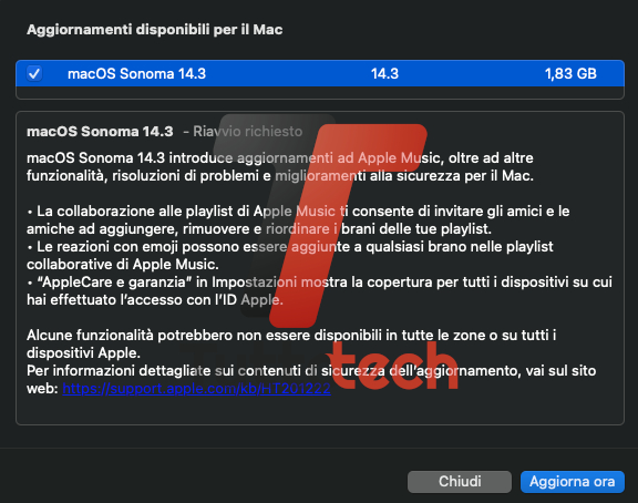 A questo indirizzo potrete trovare le note di rilascio fornite e aggiornate direttamente da Apple. Di seguito, infine, riportiamo il changelog completo di macOS 14.3 Sonoma.