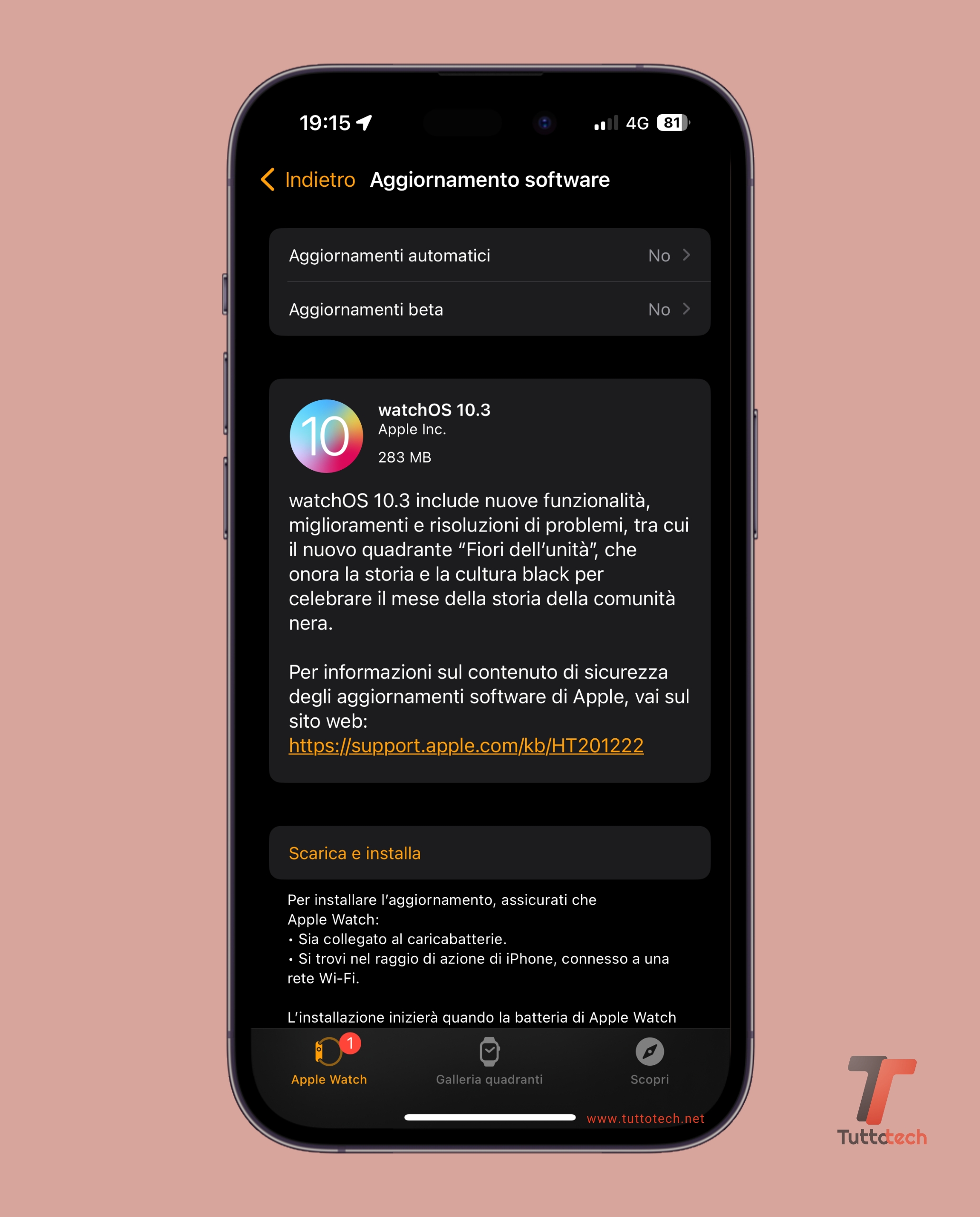 - Per aggiornare gli Apple Watch (da Watch Series 4 in avanti) è sufficiente aprire l’app Watch presente sul proprio iPhone e seguire il percorso “Generali > Aggiornamento software” e selezionare “Scarica e installa” quando verrà rilevata la presenza del nuovo aggiornamento; per procedere, iPhone e Apple Watch dovranno rimanere nel raggio di portata della connessione, mentre lo smartwatch dovrà avere almeno il 50% di carica ed essere mantenuto in carica. Per potere installare watchOS 10.3, l’app Watch richiede che sull’iPhone associato sia stato effettuato l’aggiornamento ad iOS 17.3.