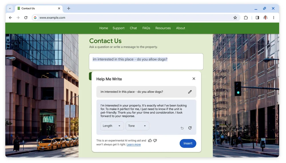 C’è poi la classica funzione di intelligenza artificiale generativa per la scrittura. Google Chrome introdurrà nella versione che verrà distribuita il mese prossimo una funzione d’aiuto per scrivere testi in vari contesti, ad esempio recensioni di luoghi, richieste formali sugli affitti di appartamenti o risposte amichevoli per degli inviti. Anche per questa funzione non ci sono da aprire barre laterali alla Microsoft Edge con Copilot, ma basta fare clic con il pulsante destro del mouse, selezionare “Help me write” e digitare un prompt in poche parole per generare il testo richiesto.