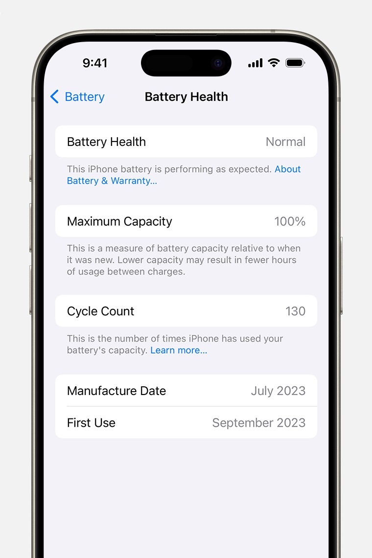 - Conteggio dei cicli: è una novità degli iPhone 15; mostra il numero di cicli di ricarica effettuati dall’utente.