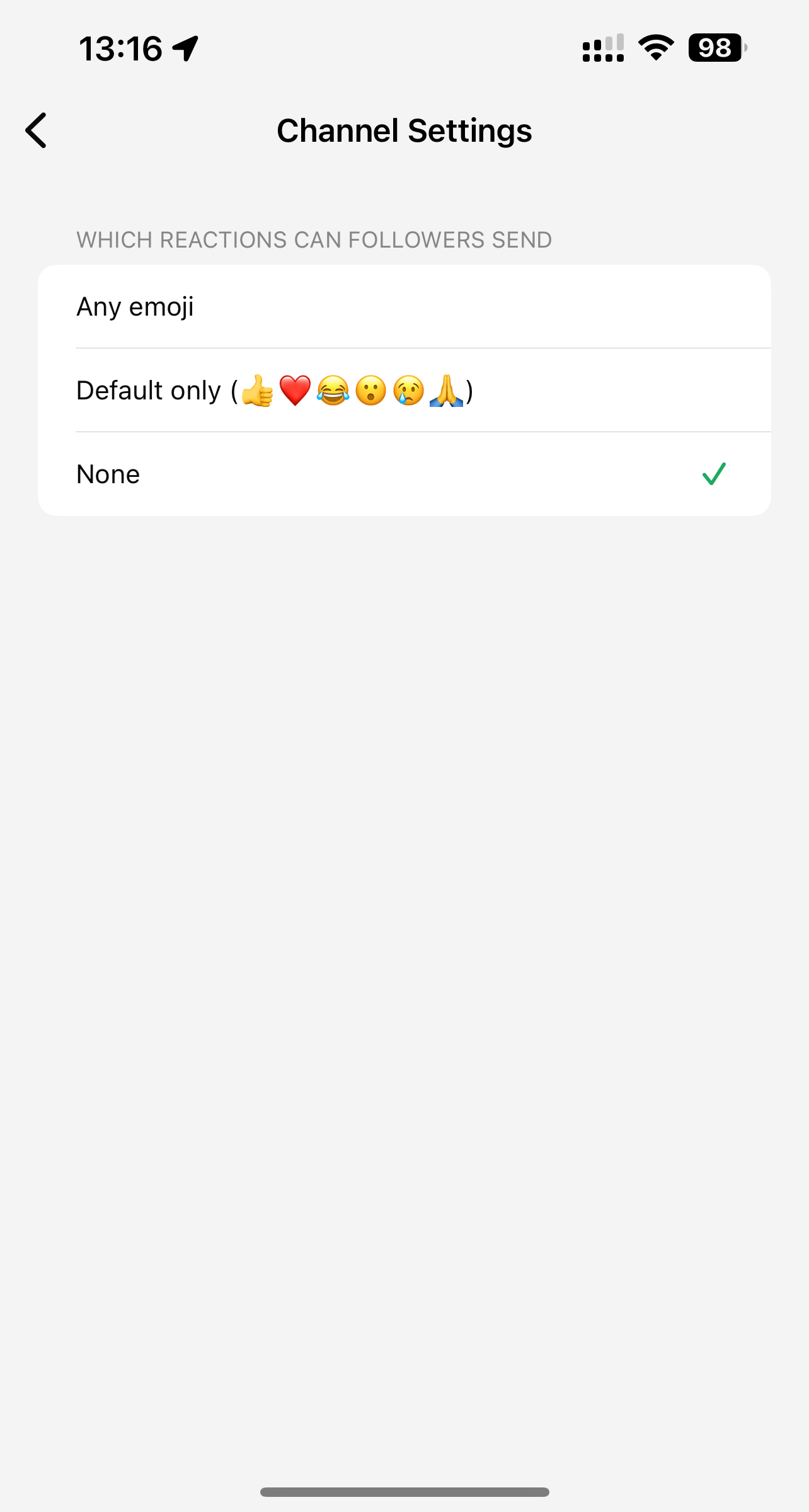 Passando oltre, vediamo adesso una funzionalità che in WhatsApp Beta per Android era già stata avvistata a partire dalla build 2.24.4.17: la disattivazione delle reazioni nei canali. Come potete vedere dallo screenshot seguente, alcuni beta tester dell’app per iOS possono sfruttare questa nuova opzione, che — ove i proprietari dei canali lo ritengano opportuno — consente di ridare centralità ai contenuti, limitando le possibilità di interazione ma anche eventuali fraintendimenti da parte degli utenti.