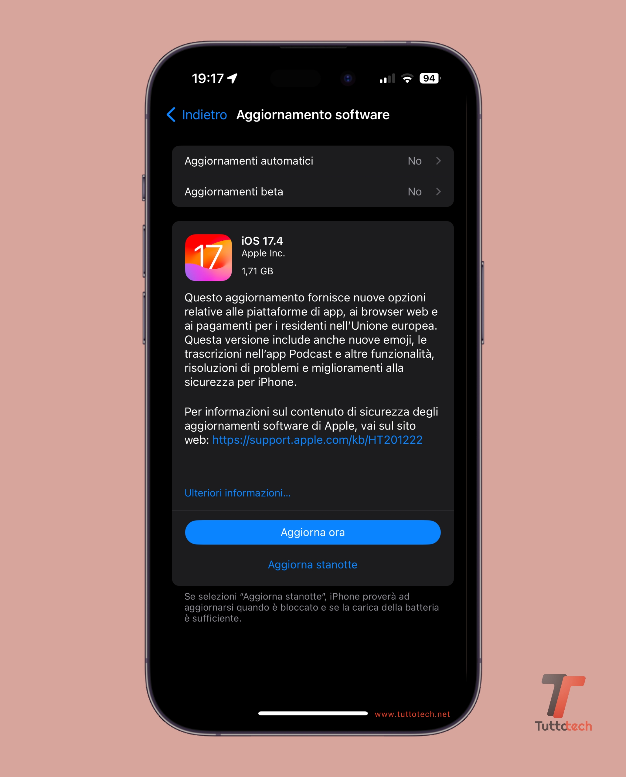 Nello specifico di iOS 17, la build che porta con sé iOS 17.4 ha un peso di 1,71 GB su iPhone 14 Pro (provenendo da iOS 17.3).