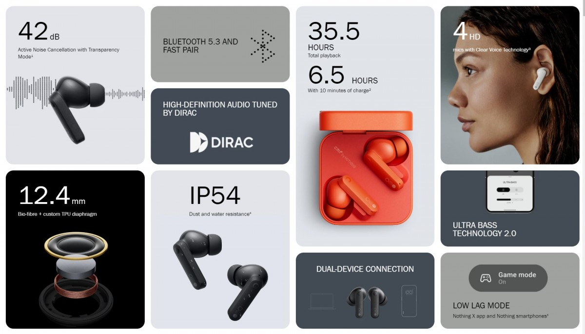 Sul fronte delle caratteristiche tecniche, i CMF Buds pur presentandosi come una versione più economica dei Buds Pro non mancano di due qualità fondamentali per un paio di auricolari true wireless moderni: ci sono infatti l’ANC, e cioè la cancellazione attiva del rumore (che è però a 42 dB rispetto ai 45 dB del modello Pro), e la modalità trasparenza, che permette di poter indossare le cuffie senza essere isolati dall’ambiente circostante. I microfoni invece di essere 6 come sulla versione Pro sono 4.