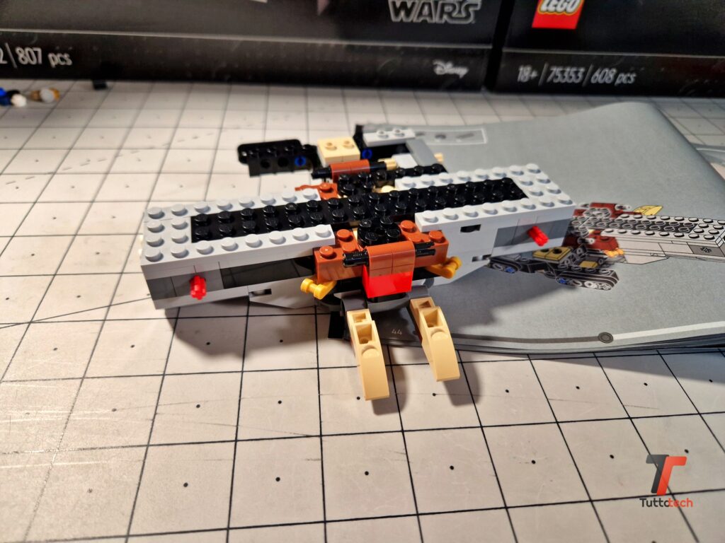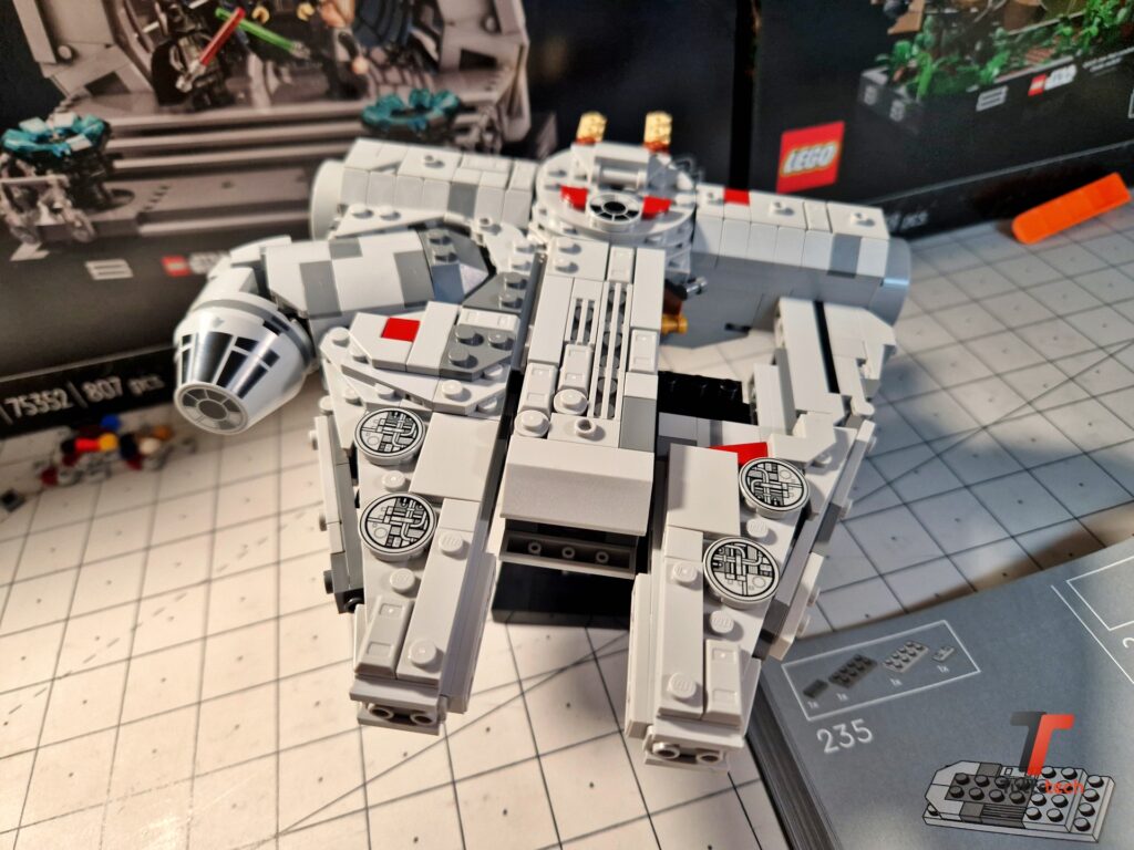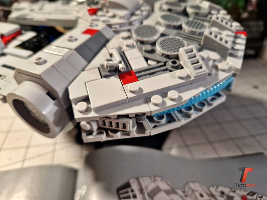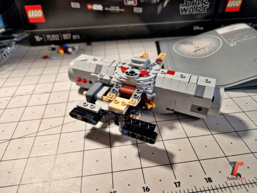 Decisamente interessanti le soluzioni adottate dai designer LEGO per realizzare la particolare forma dell’astronave, con 4 elementi di forma vagamente triangolare fissati al corpo centrale, con una parte superiore e una inferiore. Non aspettatevi le sezioni apribili dei modelli precedenti, né tantomeno la complessità dei dettagli della UCS (Ultimate Collector Series), ma non mancano i dettagli in grado di stupire, come i cannoni nella parte superiore, o la cabina di guida con tutti gli elementi stampati. Nella parte posteriore inoltre è stato utilizzato un lungo tubo di colore azzurro/trasparente per simulare le luci dei motori.