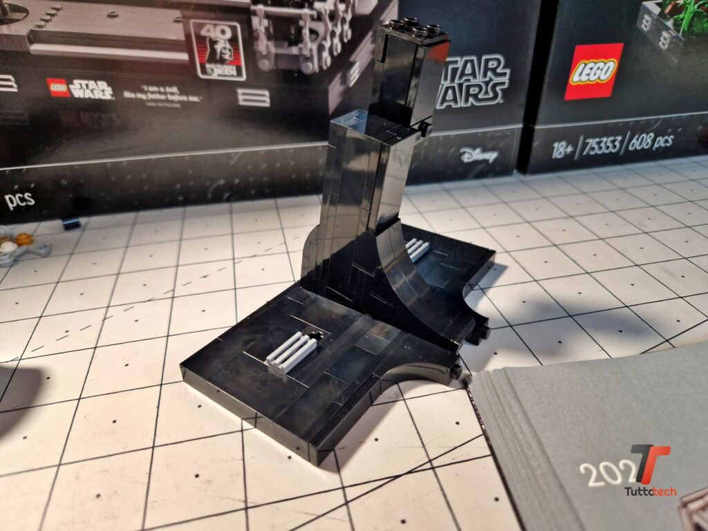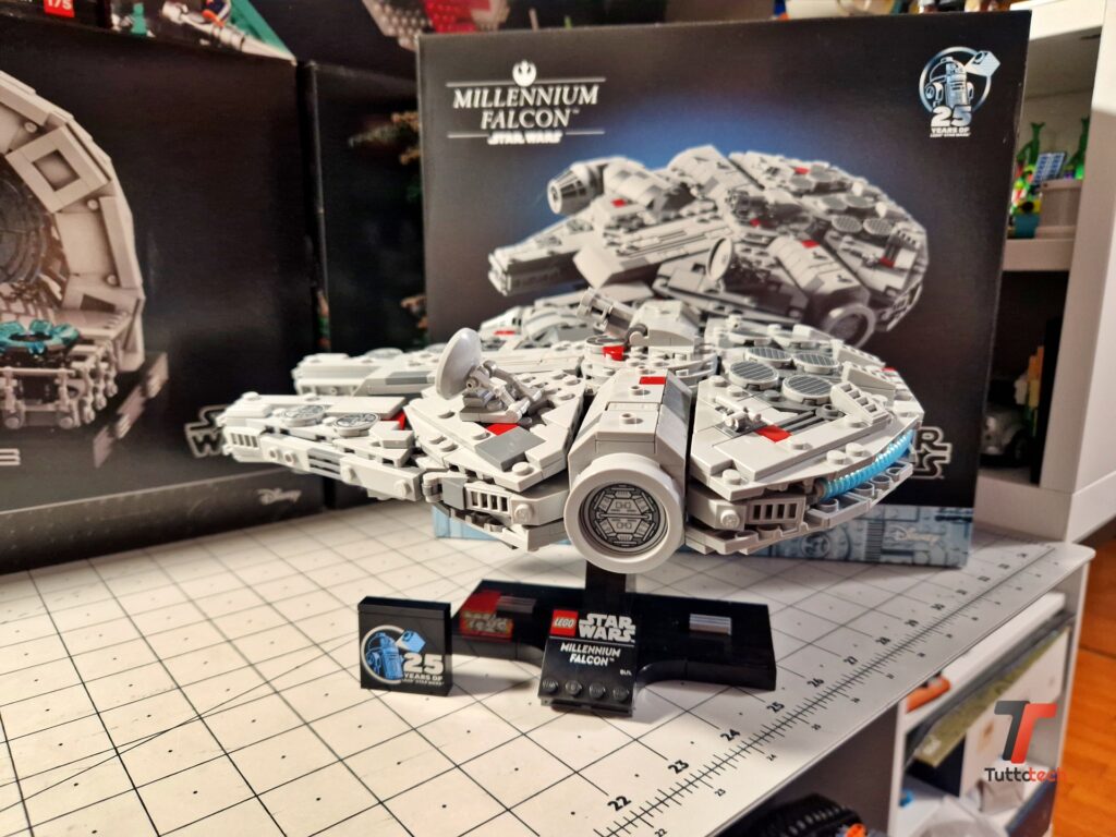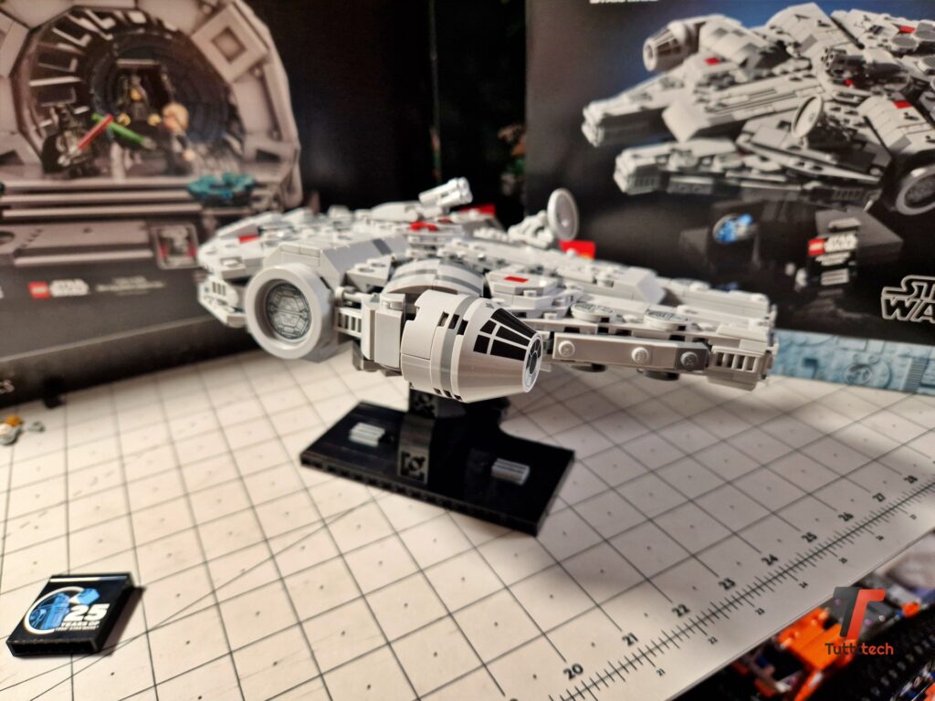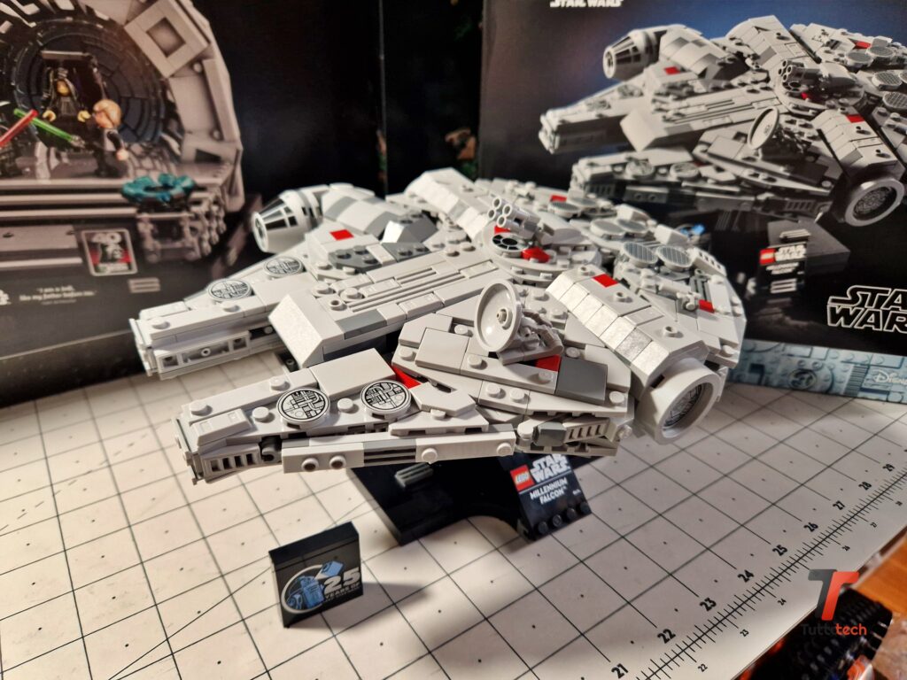 Nel complesso sarà assolutamente facile trovargli posto, viste le dimensioni tutto sommato compatte: 24 centimetri di lunghezza, 19 di larghezza e 14 di altezza. Sulla base è presente un elemento 4×4, parzialmente liscio, con i loghi LEGO e Star Wars e il nome della nave. Nella confezione è presente anche un mattoncino celebrativo del venticinquesimo anniversario della collaborazione tra i due colossi.