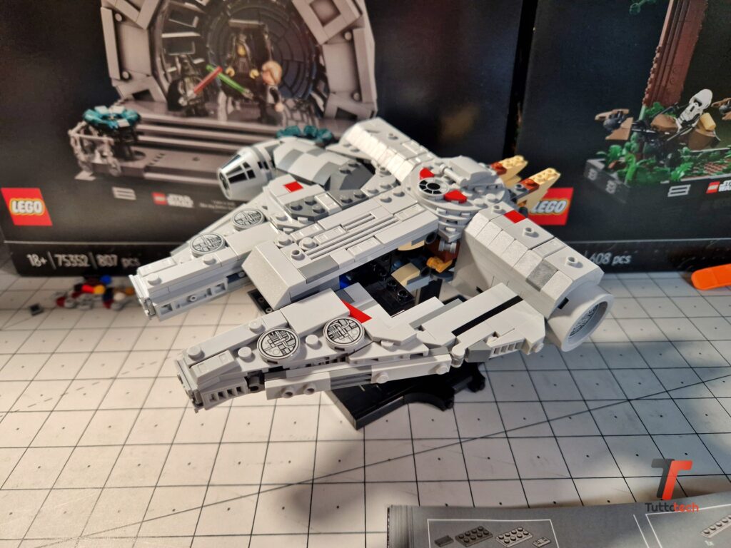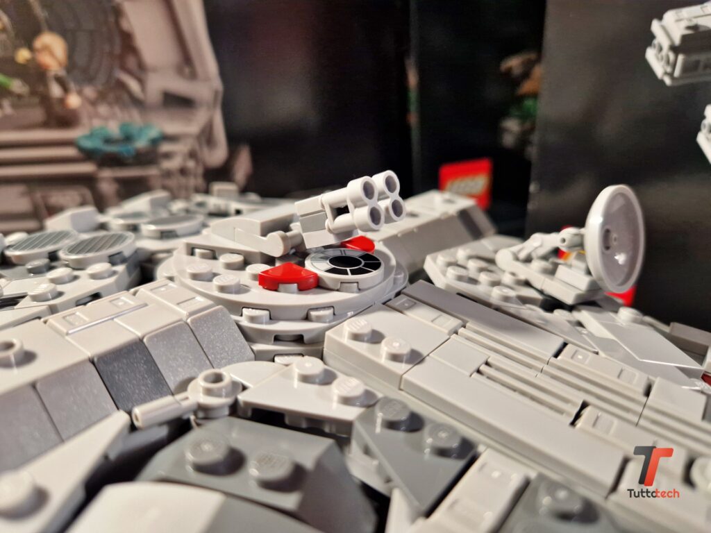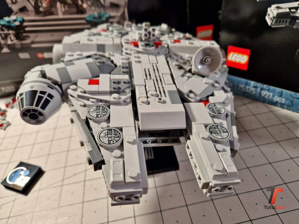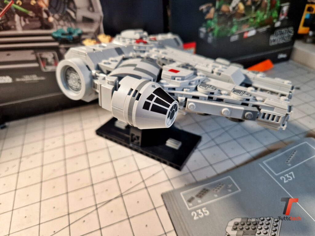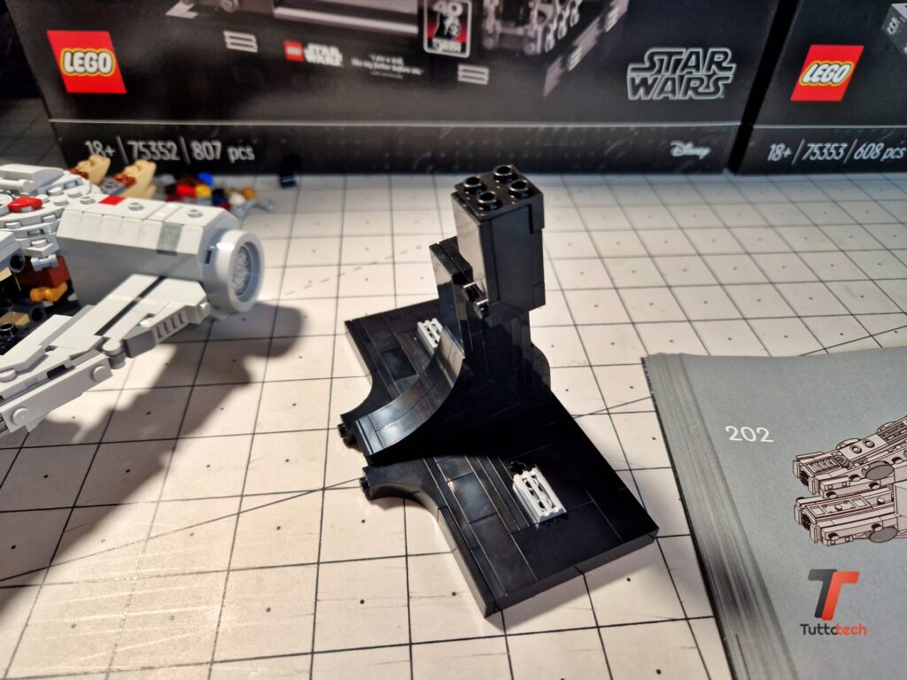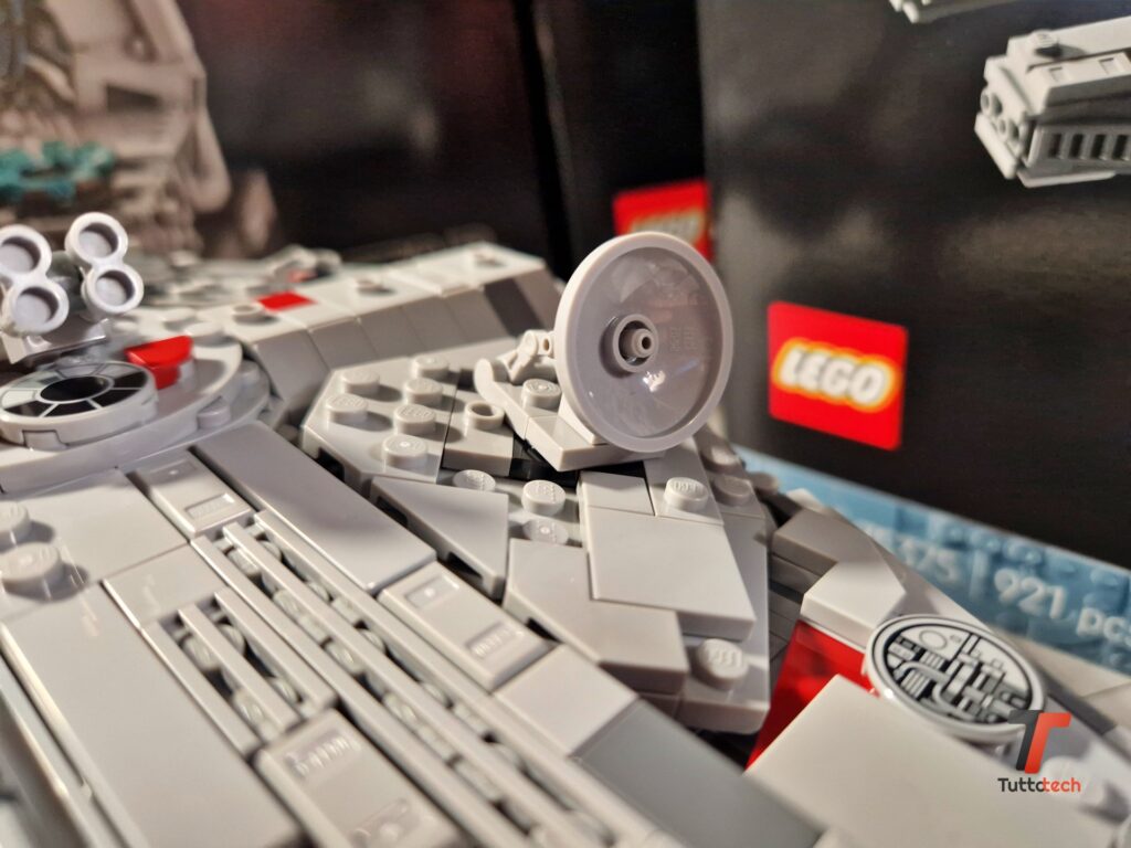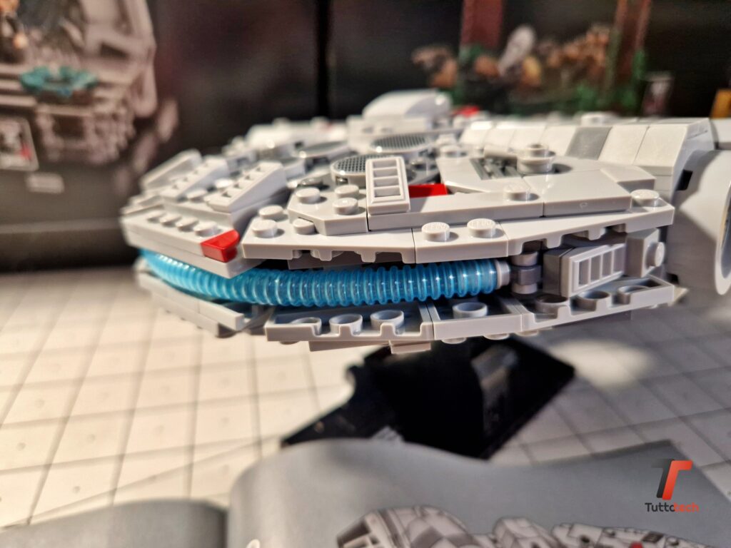 Ovviamente si tratta di un set pensato per essere esposto, sotto una bella teca per proteggerlo dalla polvere, o su uno scaffale in mezzo ad altri set iconici. Per favorire l’esposizione LEGO ha inserito anche un piedistallo, completamente nero, che permette di fissare il Millennium Falcon con una leggera inclinazione verso la parte anteriore, fornendo al modellino una posa estremamente dinamica che consente a chiunque di ammirare ogni dettaglio.