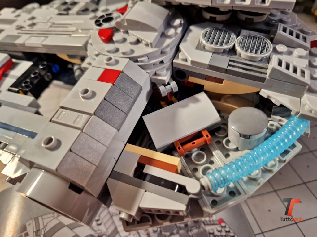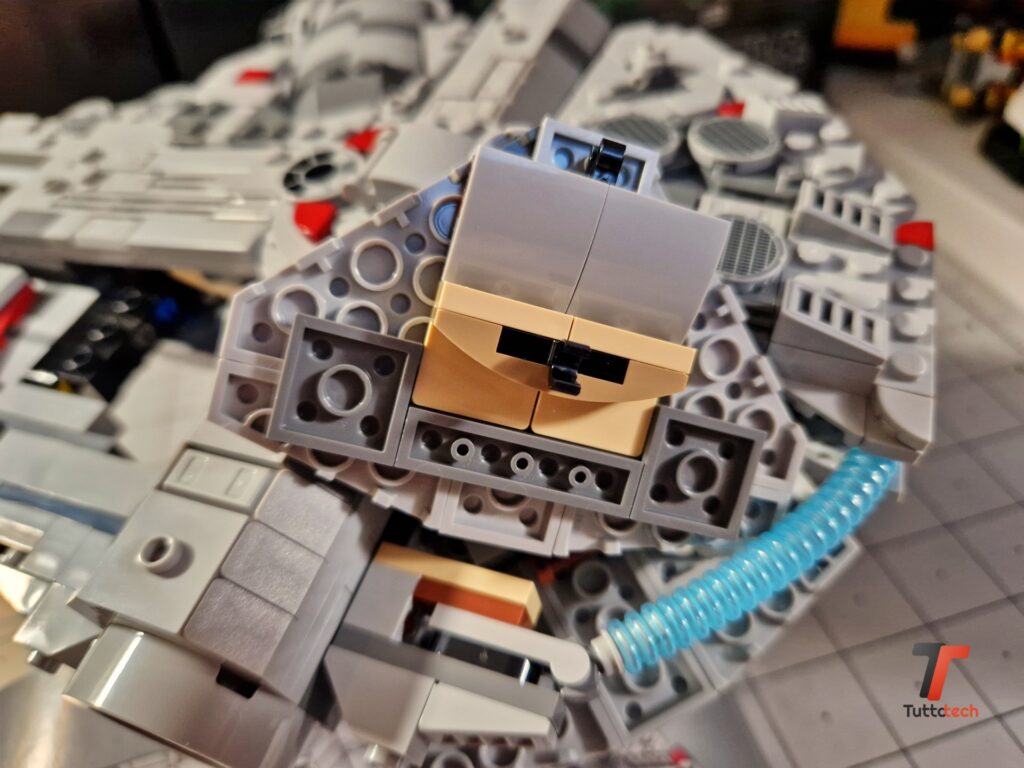 Troviamo alcuni mattoncini circolari 1×1 che rappresentano l’equipaggio della nave, nello specifico Han Solo. Chewbacca e R2-D2, mentre in un altro angolo della nave è stata ricreata la scena in cui C-3PO interrompe le effusioni tra Han Solo e la principessa Leia. C’è spazio anche per la scena in cui Obi-Wan Kenobi insegna a Luke Skywalker l’uso della Forza. Ovviamente ci vuole molta fantasia, visto che si tratta solo di qualche elemento che resta completamente nascosto una volta terminato il montaggio, visibile nelle prime fasi.