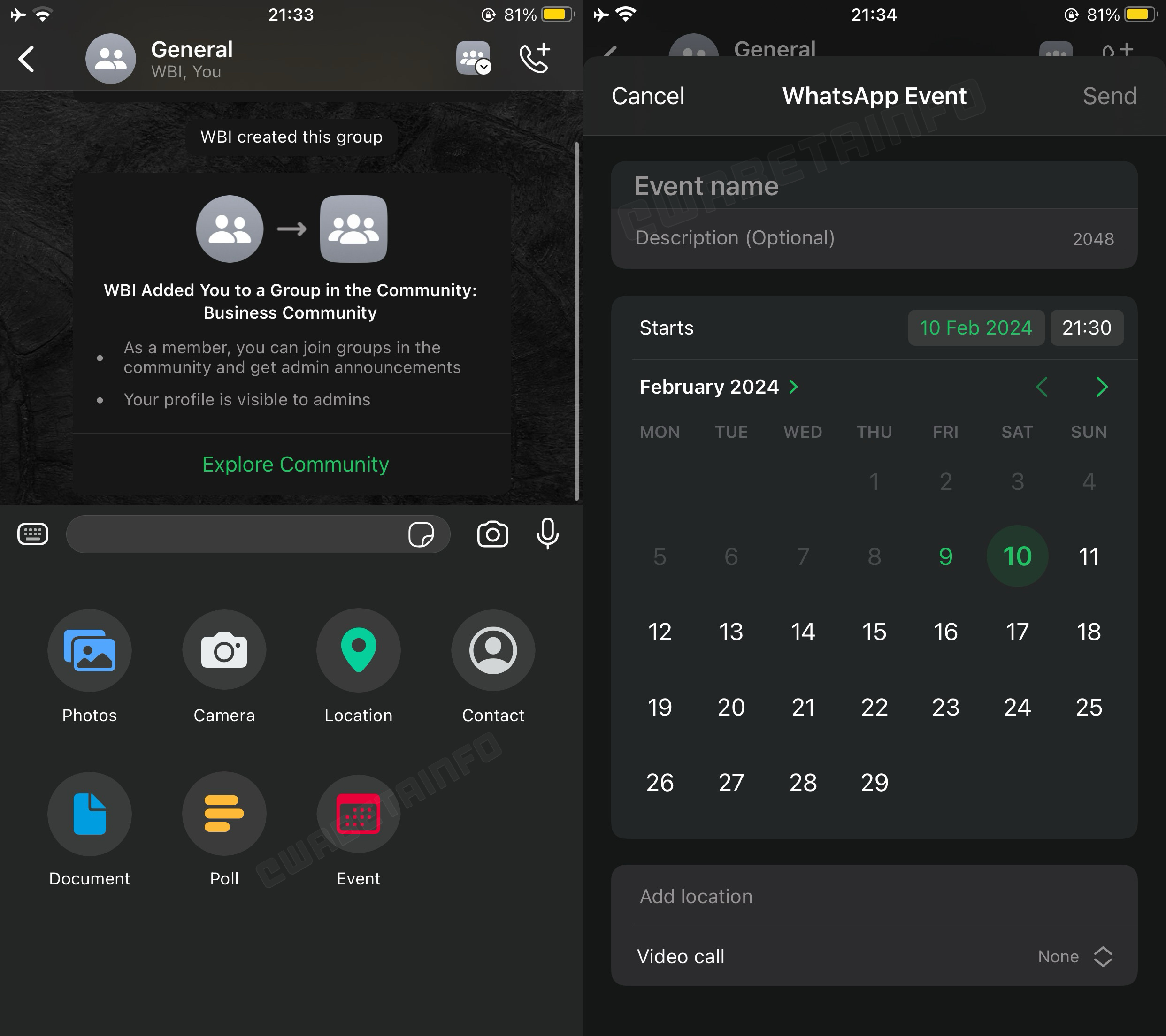 Prossimamente WhatsApp offrirà una nuova opzione per consentire agli utenti di creare eventi nelle chat di gruppo della community. Detti eventi includeranno un nome, una descrizione, una data di inizio designata, una posizione opzionale e una funzione per avviare una videochiamata una volta iniziato l’evento.