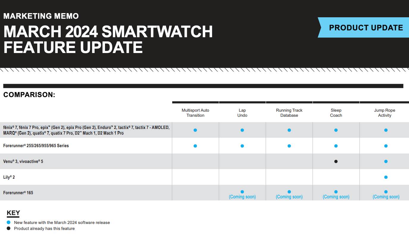Nel corso delle ultime settimane, Garmin ha rilasciato diversi aggiornamenti per i suoi smartwatch e sportwatch, con alcune novità e diverse correzioni e miglioramenti. Oggi, 28 marzo, l’azienda ha fatto il punto in una nota, ricapitolando le nuove funzioni introdotte con quello che definisce aggiornamento di marzo 2024, una sorta di major update parte di un programma di corposi aggiornamenti rilasciati (di solito) ogni tre mesi a partire da agosto 2022.