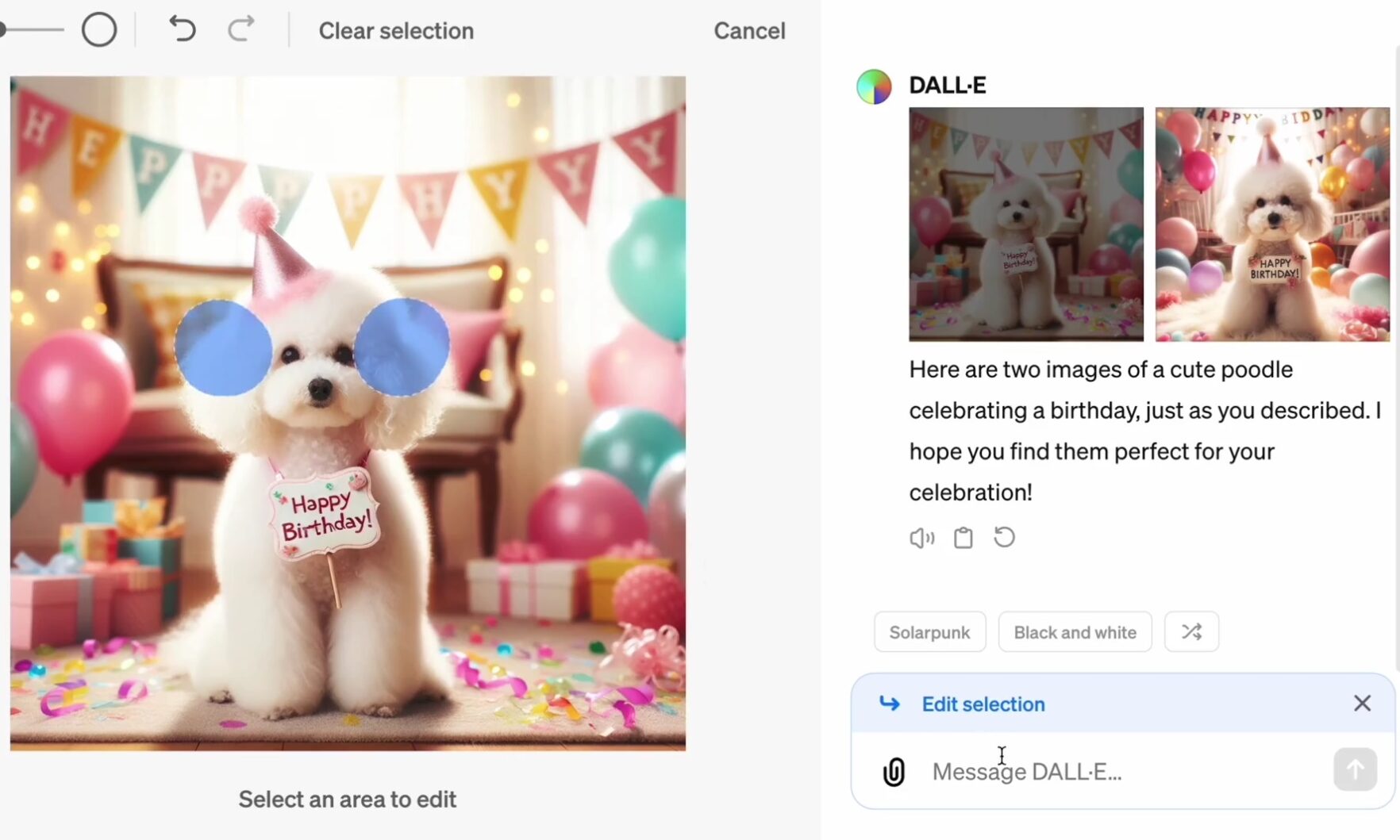 Nell’esempio seguente viene mostrato l’utente che evidenzia le orecchie di un barboncino e chiede a DALL-E di aggiungere dei fiocchi.