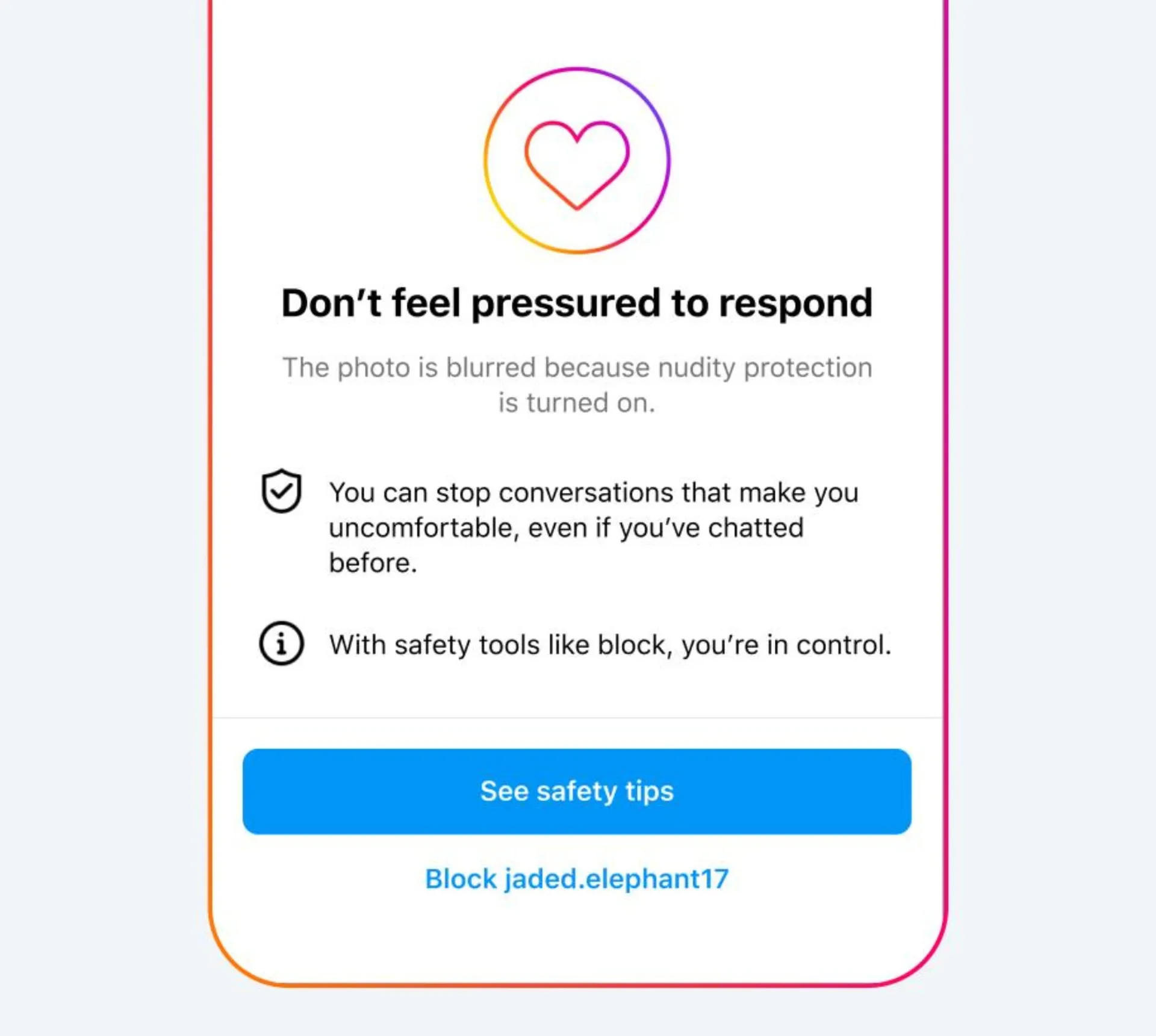 La protezione studiata da Instagram funziona sia in entrata sia in uscita. Con lo “scudo” attivo, nel caso in cui un messaggio privato contenga un’immagine di nudo non solo questa comparirà sfocata, ma la ricezione sarà anche accompagnata da una schermata di avviso che recita: