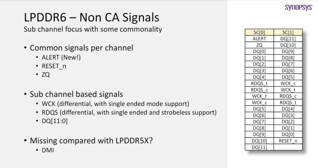 Come anticipato sopra, abbiamo già trattato l’argomento LPDDR6, tuttavia sono emerse ulteriori informazioni che secondo noi meritano di essere menzionate. Le varianti LPDDR6, che successivamente saranno rimpiazzate dalle LPDDR6X, partiranno da 10.066 MT/s per arrivare a 14.400 MT/s, un netto miglioramento rispetto alle diverse varianti LPDDR5 (LPDDR5X/T) che possono arrivare massimo a 9.600 MT/s. Anche qui, le memorie LPDDR6 non offriranno solo velocità più spinte, ma porteranno un altro importante aggiornamento nel design dei moduli che riguarda l’ampiezza del singolo canale di memoria. Si passera a un design a singolo canale 32 bit a uno canale a 24 bit che a sua volta è composto da due sottocanali da 12 bit.