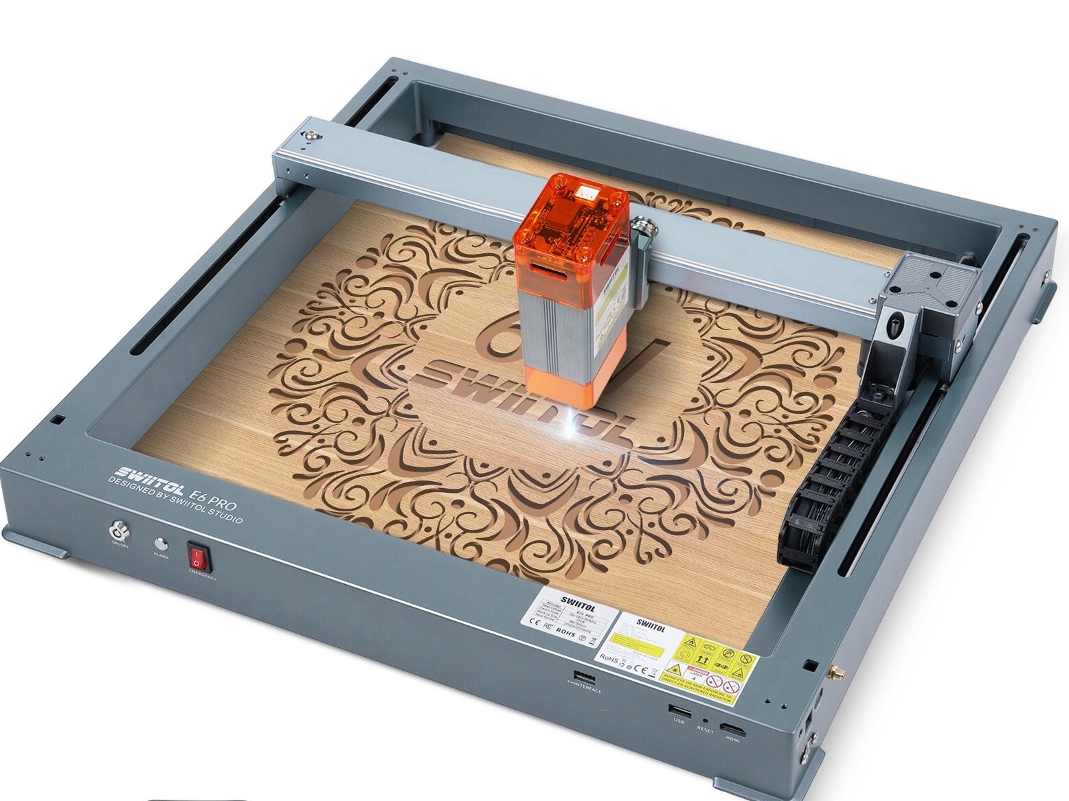 La protagonista è la taglierina/incisore laser Swiitol E6 Pro, dotata di una testina laser con una potenza di 6 watt, montata su un sistema a binari a doppio asse che garantisce una elevata stabilità. Si tratta di una funzione indispensabile, viste le elevate velocità di movimento che raggiungono i 36.000 millimetri al minuto. L’area operativa è di 365 x 305 millimetri e il punto laser ha una dimensione di appena 0,06 x 0,06 millimetri, per garantire immagini nitide e tagli precisi.