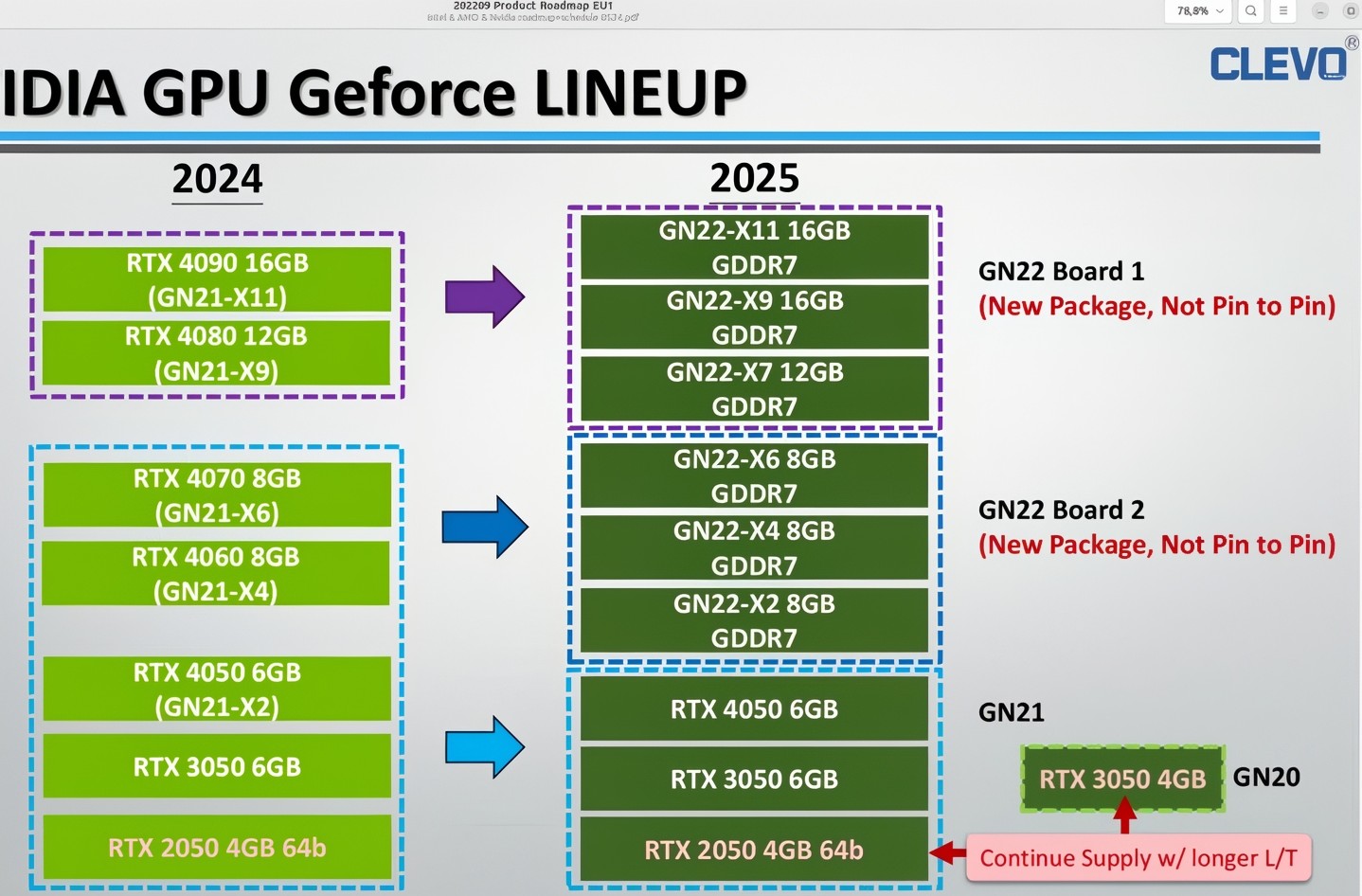 Se a Taipei, NVIDIA e lo stesso CEO dell’azienda si sono limitati a commentare che “GeForce RTX 50 è a dir poco eccitante”, a riportare l’attenzione sulla prossima gamma di GPU per portatili è il partner Clevo, azienda specializzata in notebook custom ad alto profilo, non a caso confezionati con le più potenti GPU laptop del produttore californiano. Secondo un recente leak sulla roadmap Clevo per il 2025, NVIDIA avrebbe pensato ad almeno sei nuovi modelli di GPU per PC portatili, questo ovviamente partendo dalla fascia bassa fino ai modelli top di gamma. Ma vediamo insieme tutti i dettagli.
