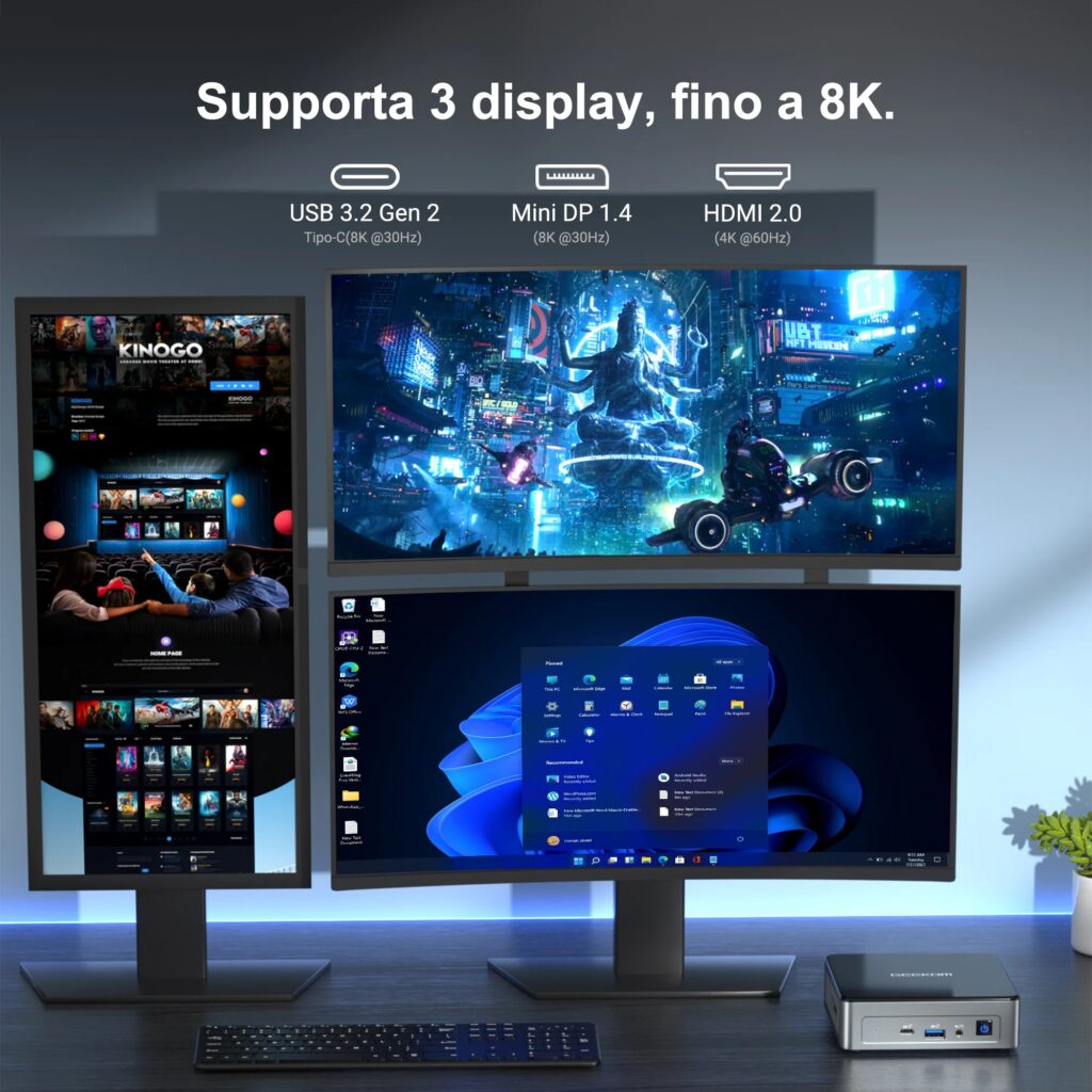 Una dotazione di serie davvero niente male, con la possibilità di collegare fino a tre monitor per massimizzare la produttività e l’esperienza di intrattenimento, visto che può gestire monitor in 4K tramite la porta HDMI e in 8K con USB e Mini DP (ma con refresh massimo a 30 Hz). Decisamente ricca la dotazione di porte di connessione, ben dieci in tutto, così da collegare numerosi accessori, quali tastiere, mouse, unità di archiviazione esterne e molto altro.