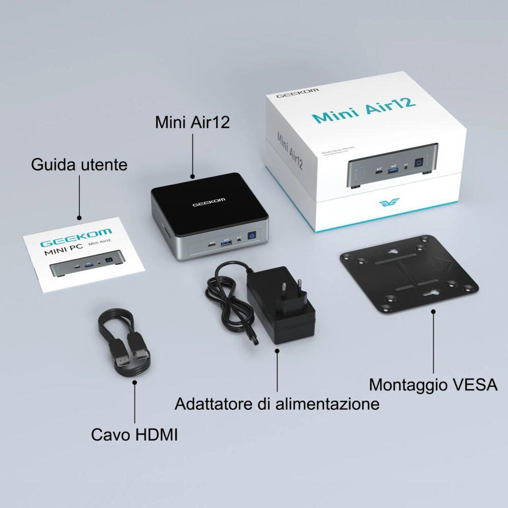 Il protagonista della promozione è GEEKOM Mini Air12, dotato di una scheda tecnica decisamente interessante e proposto a un prezzo davvero straordinario, grazie anche a un coupon esclusivo che vi permette di risparmiare altri 50 euro. Prima di scoprire l’offerta economica, diamo però un rapido sguardo alla scheda tecnica di questo piccolo gioiellino.