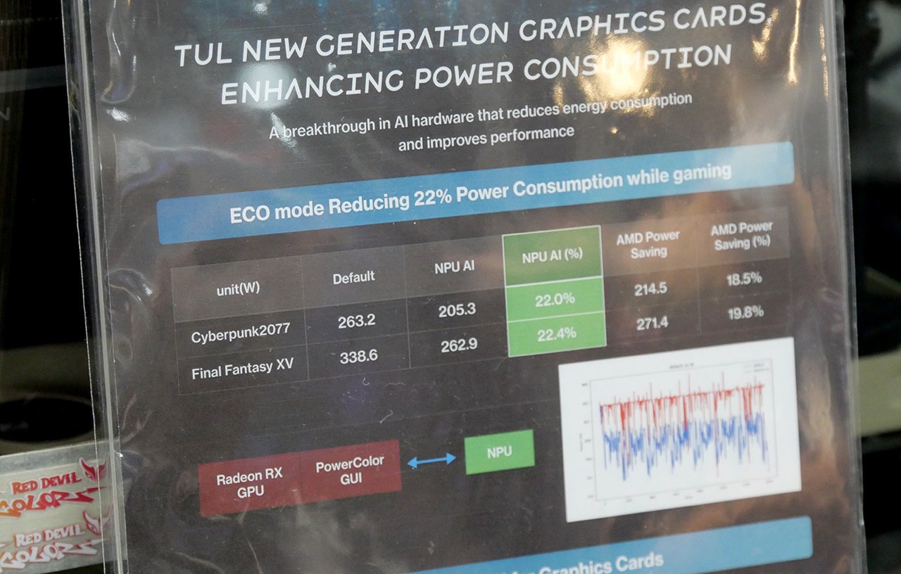 Durante le demo viste al Computex di Taipei la scorsa settimana, il sistema PowerColor con scheda video dotata di NPU riusciva realmente a ottimizzare i consumi globali, allo stesso tempo però si nota una leggera flessione del frame-rate e un incremento delle temperature dovuto alle impostazioni AI che, per ridurre la rumorosità, impostava un regime di rotazione piuttosto conservativo.