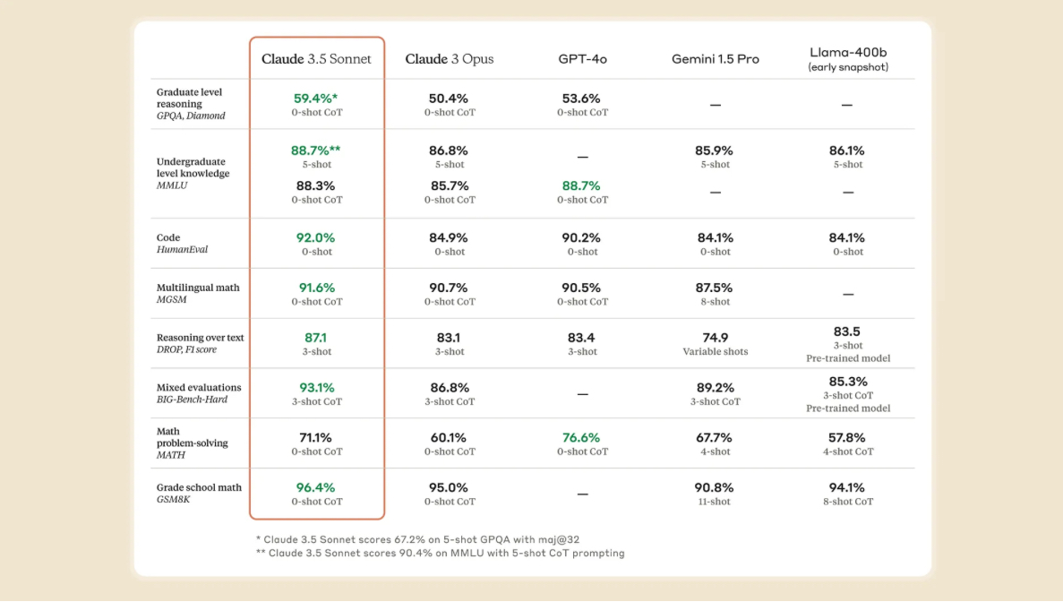 Claude 3.5 Sonnet è il modello intermedio della famiglia di modelli di IA ideati da Anthropic. La società di ricerca, infatti, ha chiamato il modello più piccolo Haiku, quello intermedio mainstream Sonnet, mentre per il modello di fascia alta ha optato per il nome Opus. Anthropic ha inoltre affermato che Claude 3.5 Sonnet supera di gran lunga il 3 Opus: il nuovo modello, infatti, è molto più veloce e performante del precedente. Inoltre, Claude 3.5 Sonnet ha superato GPT-4o, Gemini 1.5 Pro e Llama 3 400B di Meta in sette dei nove benchmark complessivi e in quattro dei cinque benchmark di visione. Osservando quindi i dati sottostanti, sembrerebbe proprio che Anthropic abbia creato un concorrente importante all’interno di questo nuovo settore.