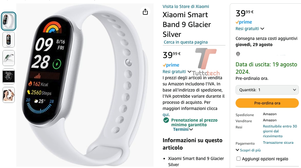 Come si evince da questo screenshot, Amazon riporta il 19 agosto 2024 come data di uscita di Xiaomi Smart Band 9. Ma a parte qualche immagine e l’indicazione sulla colorazione Glacier Silver, una delle quattro annunciate, oltre alla versione in ceramica, leggermente diversa anche per dimensioni e peso, non è emerso altro al momento. Comunque, questo è il link di Amazon alla pagina di Xiaomi Smart Band 9, prodotto di cui probabilmente ne sapremo di più nei prossimi giorni.