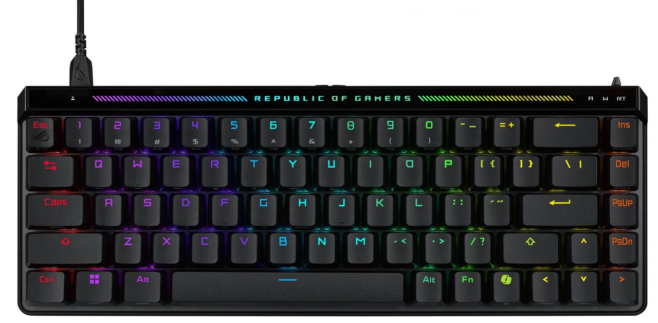 Partiamo subito con le periferiche da gioco e la ROG Falchion Ace HFX, una tastiera con layout compatto al 65% all’interno di una struttura del 60%, equipaggiata anche con tasti direzionali e di navigazione. A bordo troviamo switch magnetici ROG HFX, che offrono una sensazione di solidità e un punto di attuazione personalizzabile da 0,1 a 4,0 mm; con l’interruttore Rapid Trigger inoltre, gli utenti otterranno senza problemi i migliori tempi di digitazione e di ripetizione dei tasti possibili.