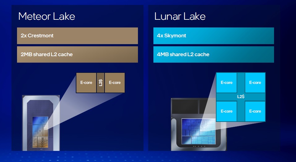 Andando nel dettaglio di Lunar Lake, la nuova generazione di CPU Intel può contare in primis sui nuovi Performance-Core “Lion Cove” e sugli Efficent-Core “Skymont”, un binomio che dovrebbe assicurare un buon equilibrio tra prestazioni CPU e consumi, con un impatto positivo anche sui sistemi di raffreddamento e le dimensioni finali del notebook. Ma non è tutto, spicca senza dubbio la nuovissima GPU integrata Intel Xe2 che, oltre a portare un incremento delle prestazioni grafiche sino al 30-40%, gestirà meglio il ray-tracing, i giochi last-gen e i setup multi-monitor (fino a 4 display 4K).
