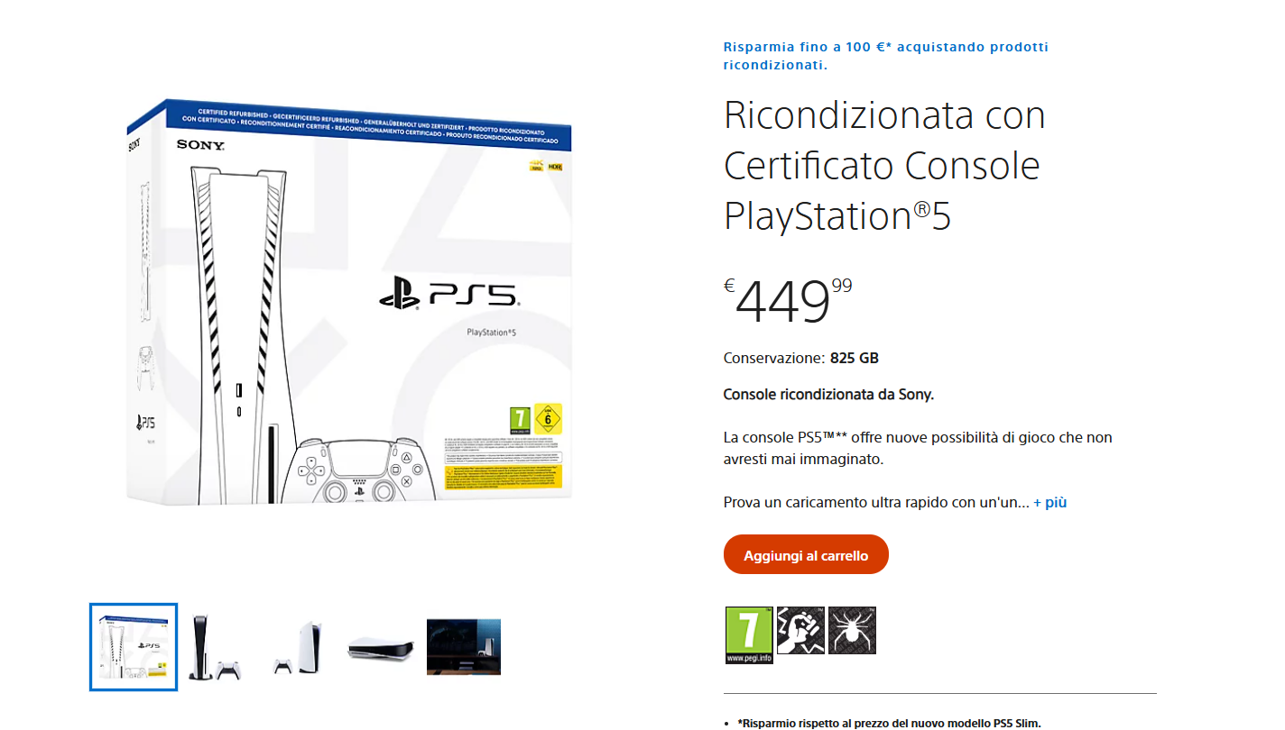 PS5 Standard in versione ricondizionata viene infatti proposta su PlayStation Direct al prezzo di 449,99 euro: una cifra che i potenziali clienti potrebbero non trovare esattamente invitante, considerando che allo stato attuale si può acquistare una PS5 Slim nuova a prezzi molti vicini, o addirittura inferiori se si considera il modello senza lettore (PS5 Slim Digital).