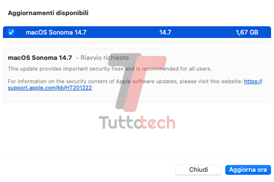 La build del settimo (e potenzialmente ultimo) aggiornamento intermedio della precedente versione di macOS, disponibile ora su tutti i computer Mac compatibili, è la 23H124 (sostituisce la 23G93 rilasciata come versione stabile di macOS 14.6.1 lo scorso 7 agosto). La build che porta con sé macOS 14.7 Sonoma ha un peso di 1,67 GB su MacBook Pro 16 M1 Pro (provenendo da macOS 14.6.1 Sonoma). Anche in questo caso, il changelog parla di aggiornamento che “fornisce importanti fix sulla sicurezza ed è consigliato a tutti gli utenti”.